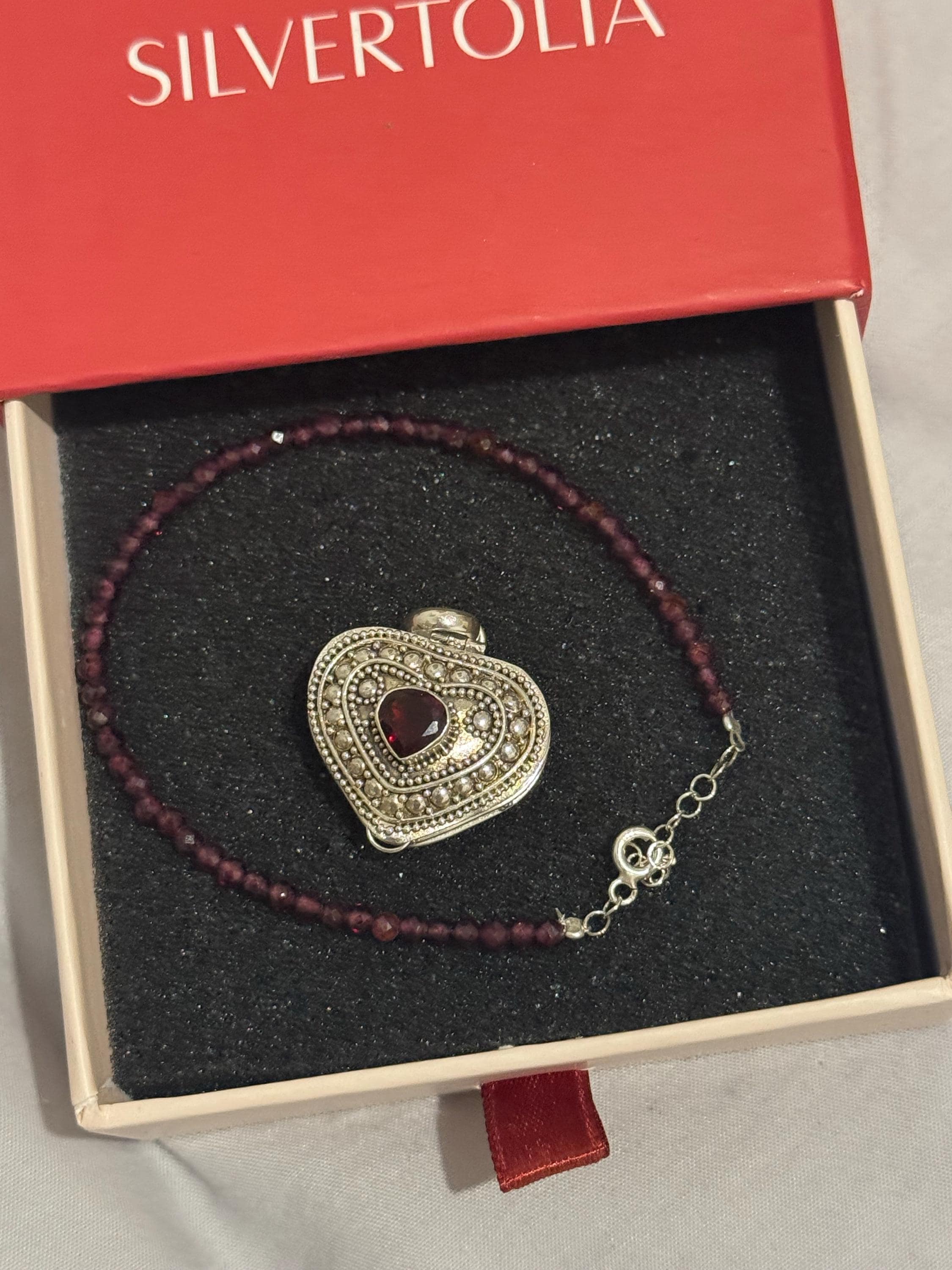 This 925 Sterling Silver Heart shaped locket pendants are is purely handmade and natural Amethyst, Garnet, Lemon Topaz and Blue Topaz are used as gemstone. Each of the lockets are 1 x 0.8 inch and have "925" stamp on their back. You can place small dried flower petals, hair/fur remain, pill, small notes etc. inside to make it a perfect memorial romantic pendant!