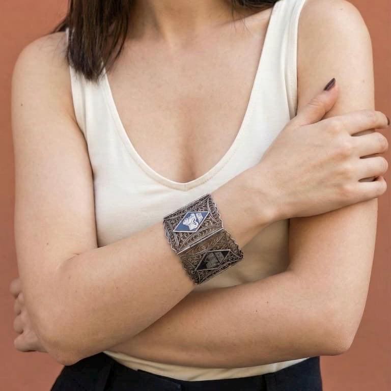 This 925 Sterling Silver Filigree bracelet is a real Iraqi antique made by mainly Mandean silversmiths on the city of Amarah near the southern Iraqi marshlands. Most of the nielloed silvers seen were produced between 1920 to 1940 (WW2 era) particularly for British service personnel.