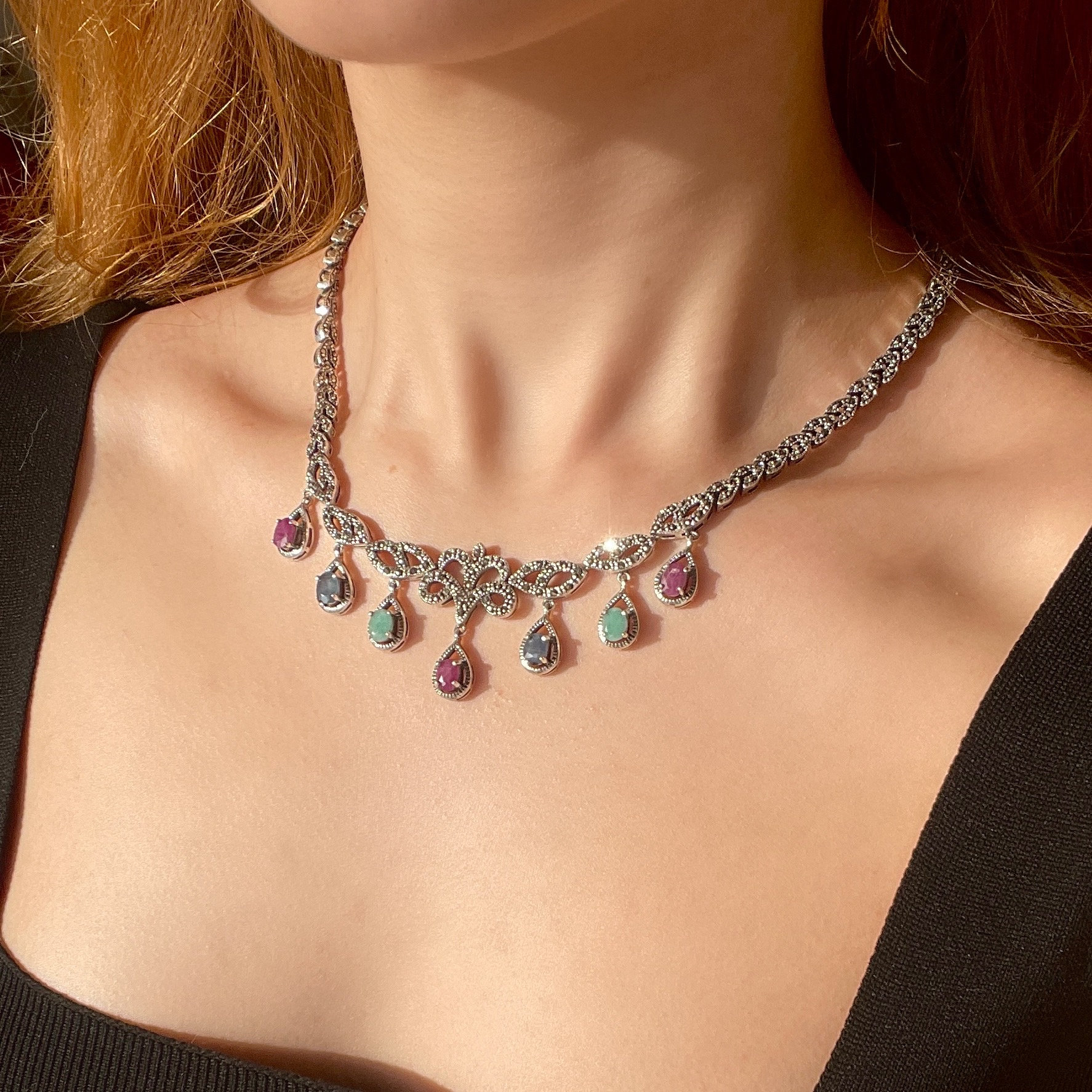 A magnificent vintage-inspired statement necklace featuring ruby, emerald, and sapphire gemstone drops framed by intricate marcasite detailing in sterling silver.