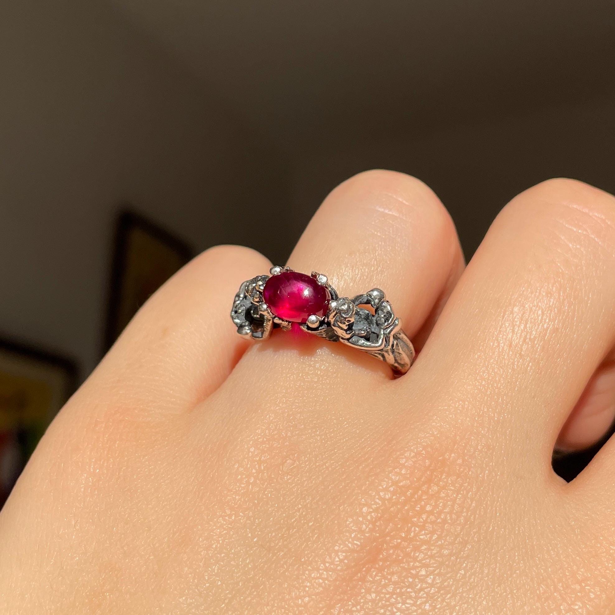 These dainty and vintage style 925 Sterling Silver rings with winged Angel figures holding baby are purely handmade and natural Pigeon Blood Ruby (1.15 ct) is used. (Please see our "Statement Rings" section for more gem options!)