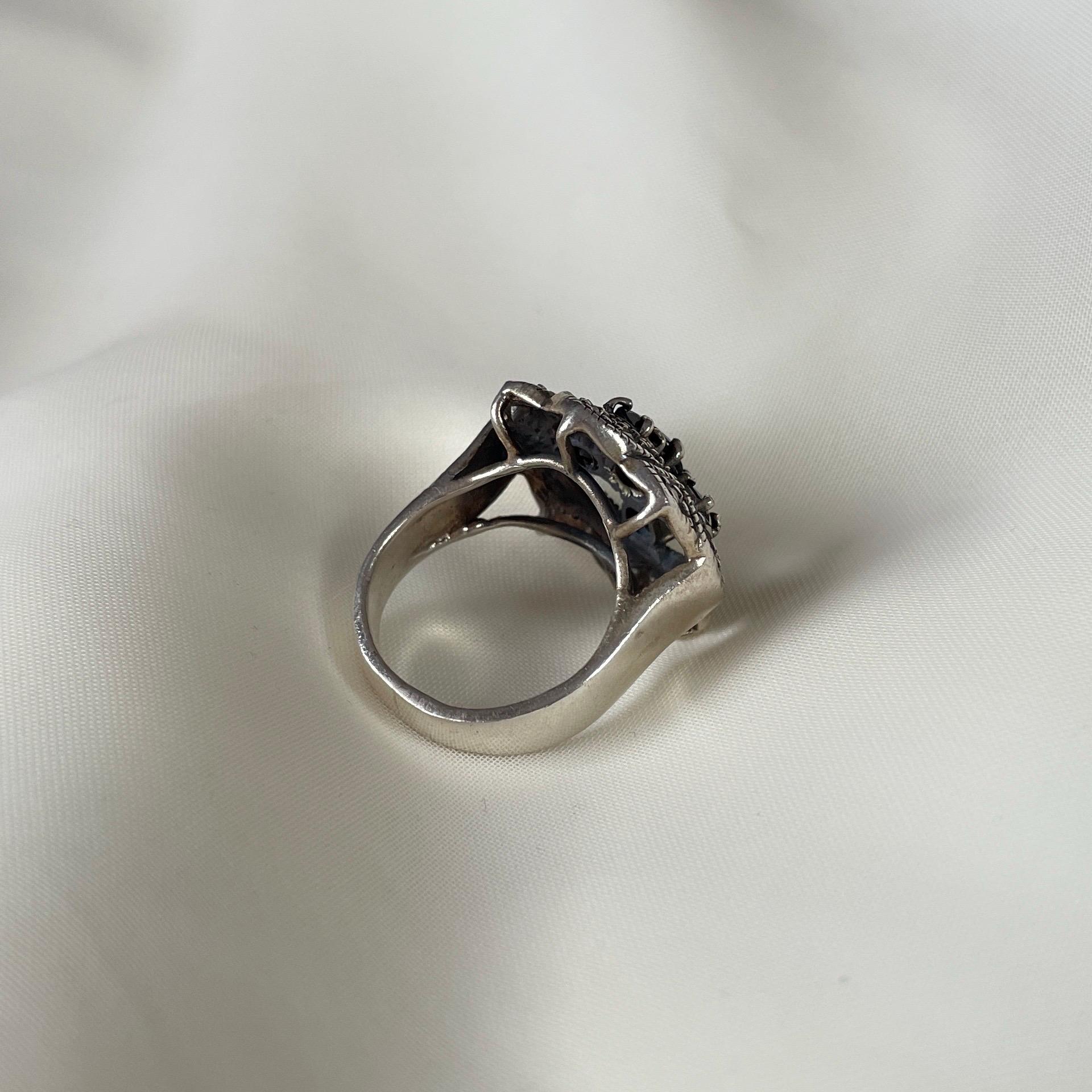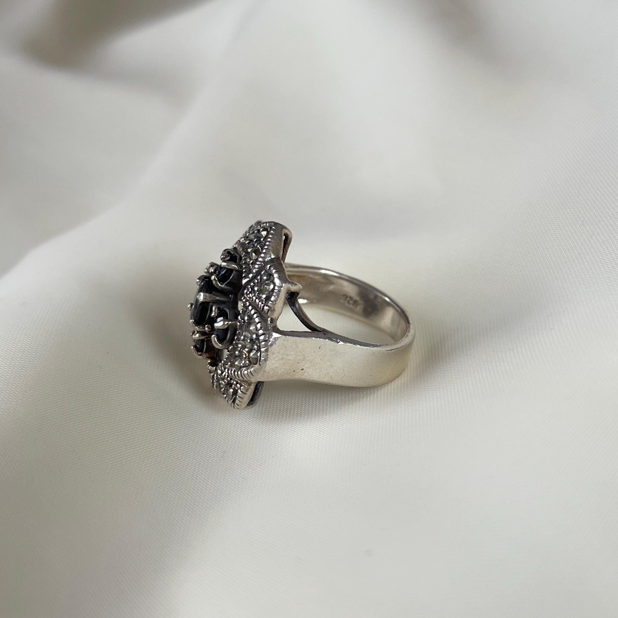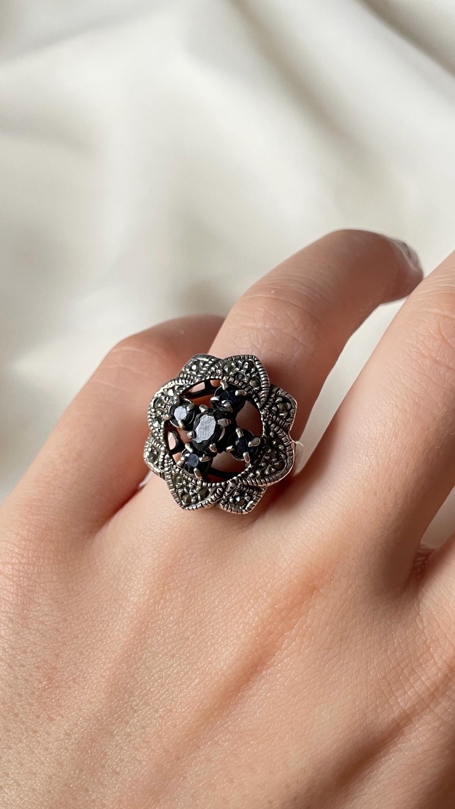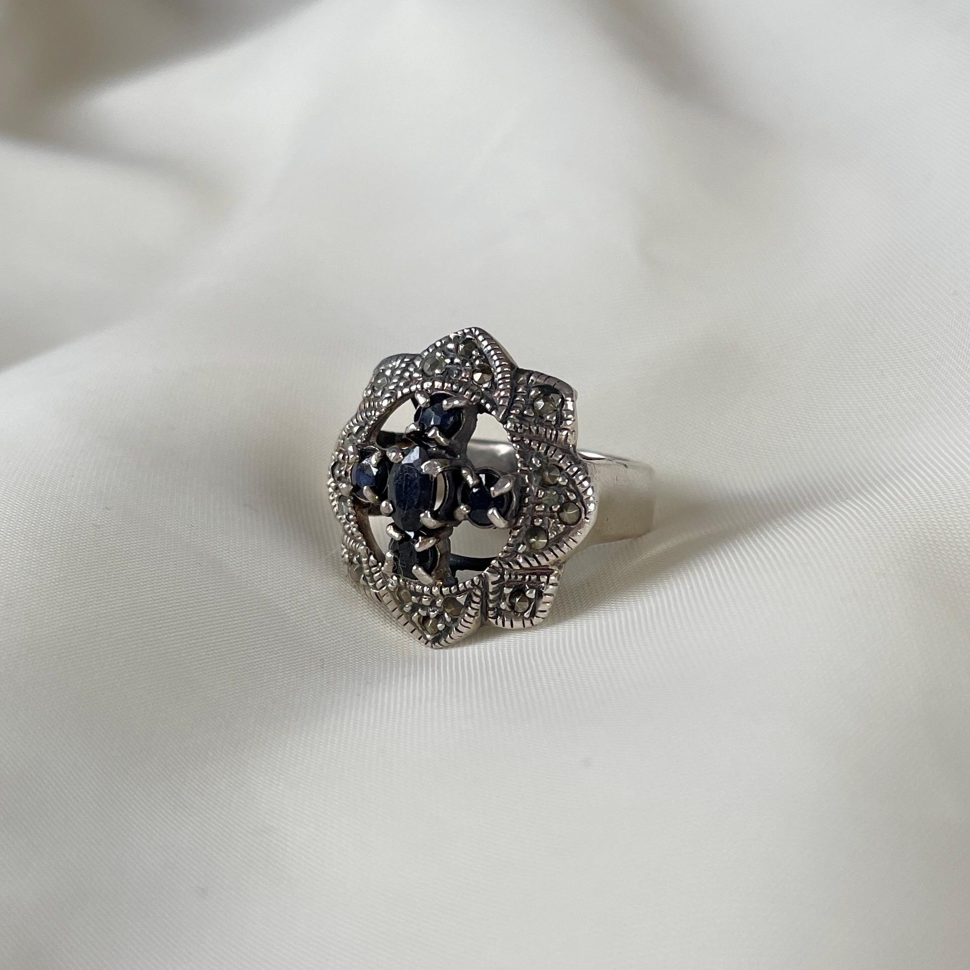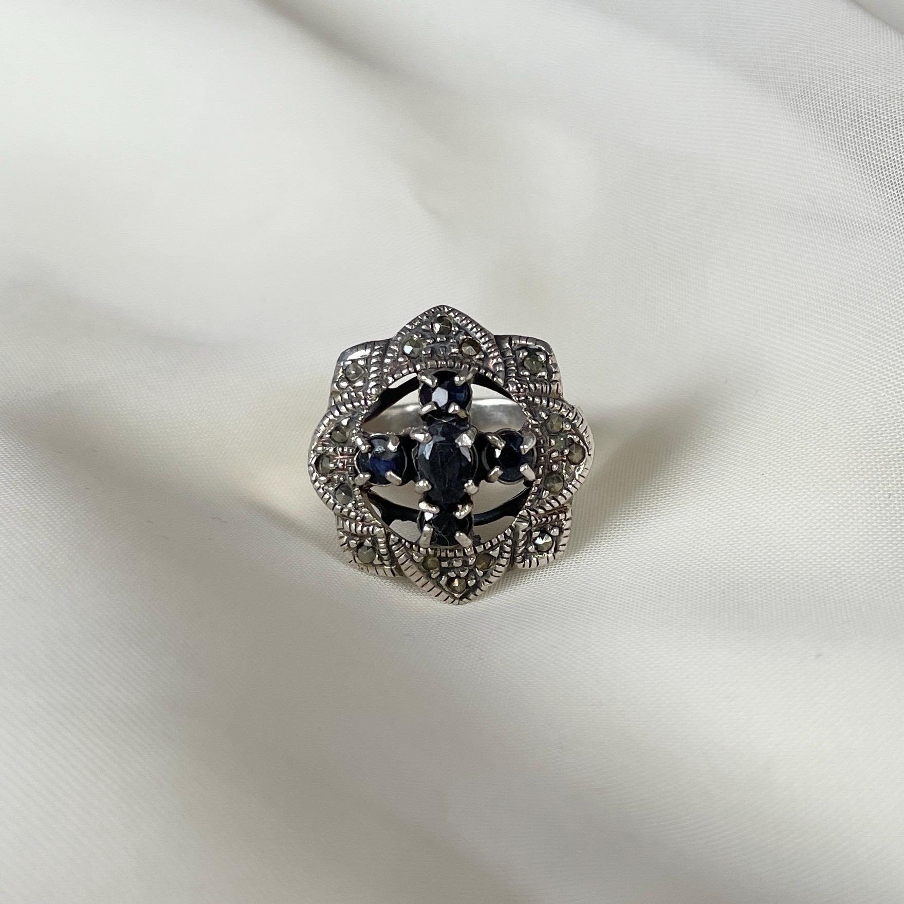 This vintage-style ring is handcrafted from 925 sterling silver and adorned with four dark Blue Sapphire one Black Sapphire (in the middle) and shimmering marcasites. With its gothic floral shape and antique finish, it captures the spirit of timeless elegance and mystery. Whether worn as a bold statement or a meaningful gift, this ring is designed to stand out.