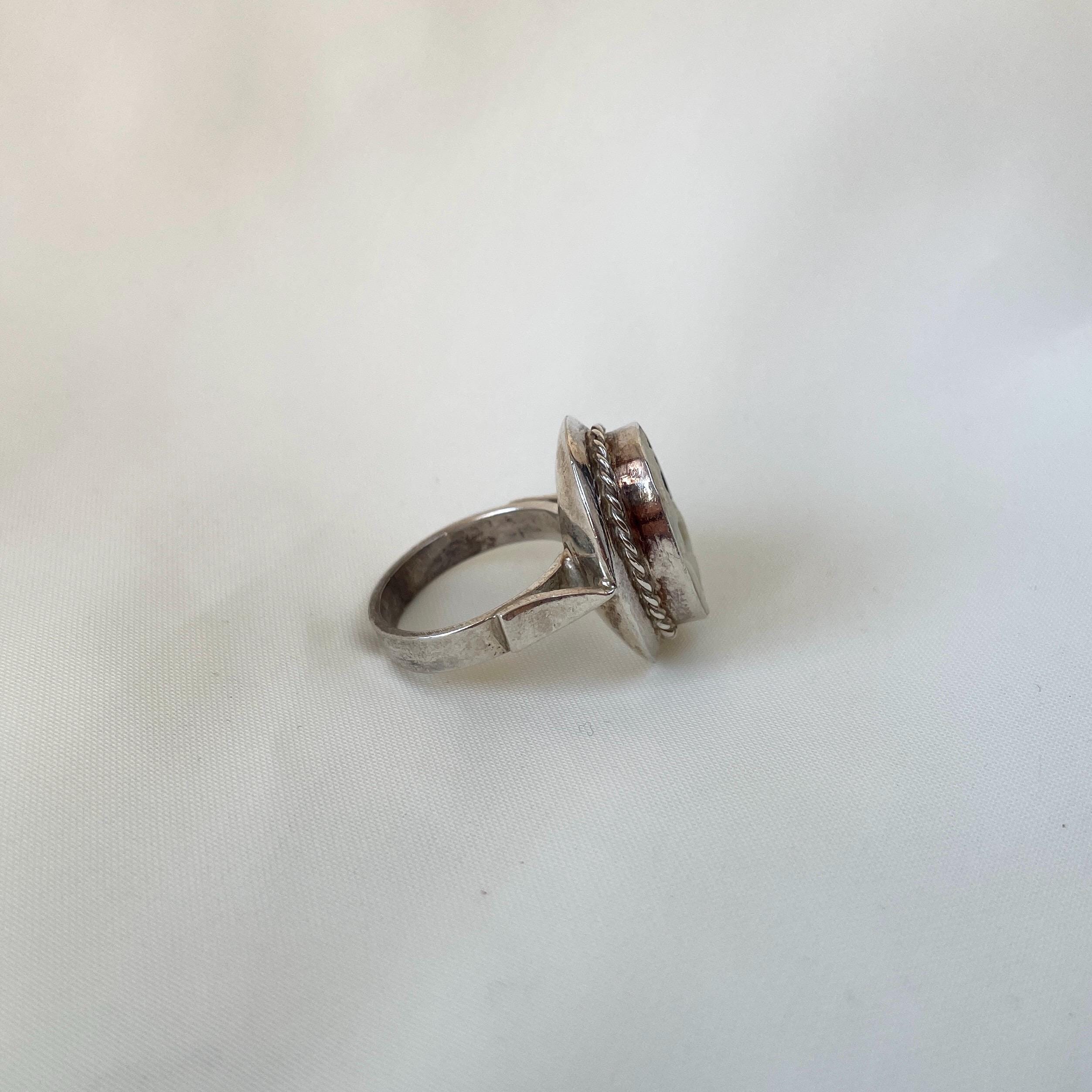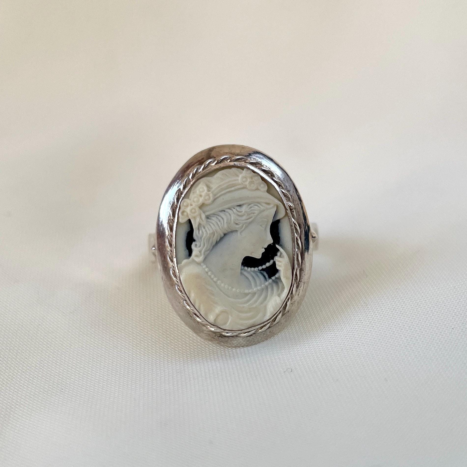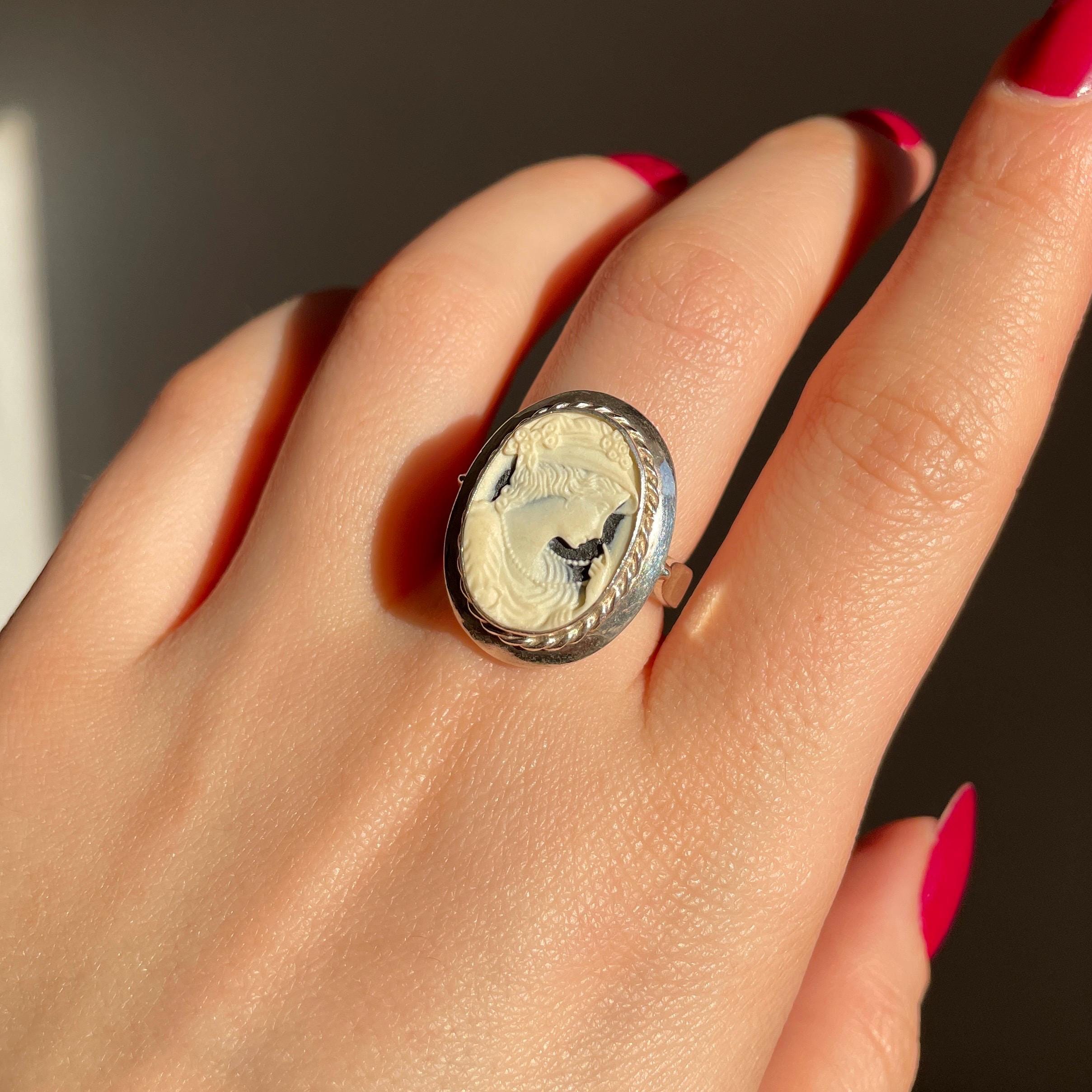 This vintage inspired 925 Sterling Silver Cameo ring of elegant lady portrait is purely handmade. The dimensions of the ring are 1 x 0.7 inches. ("925" stamp is at the back of the ring)