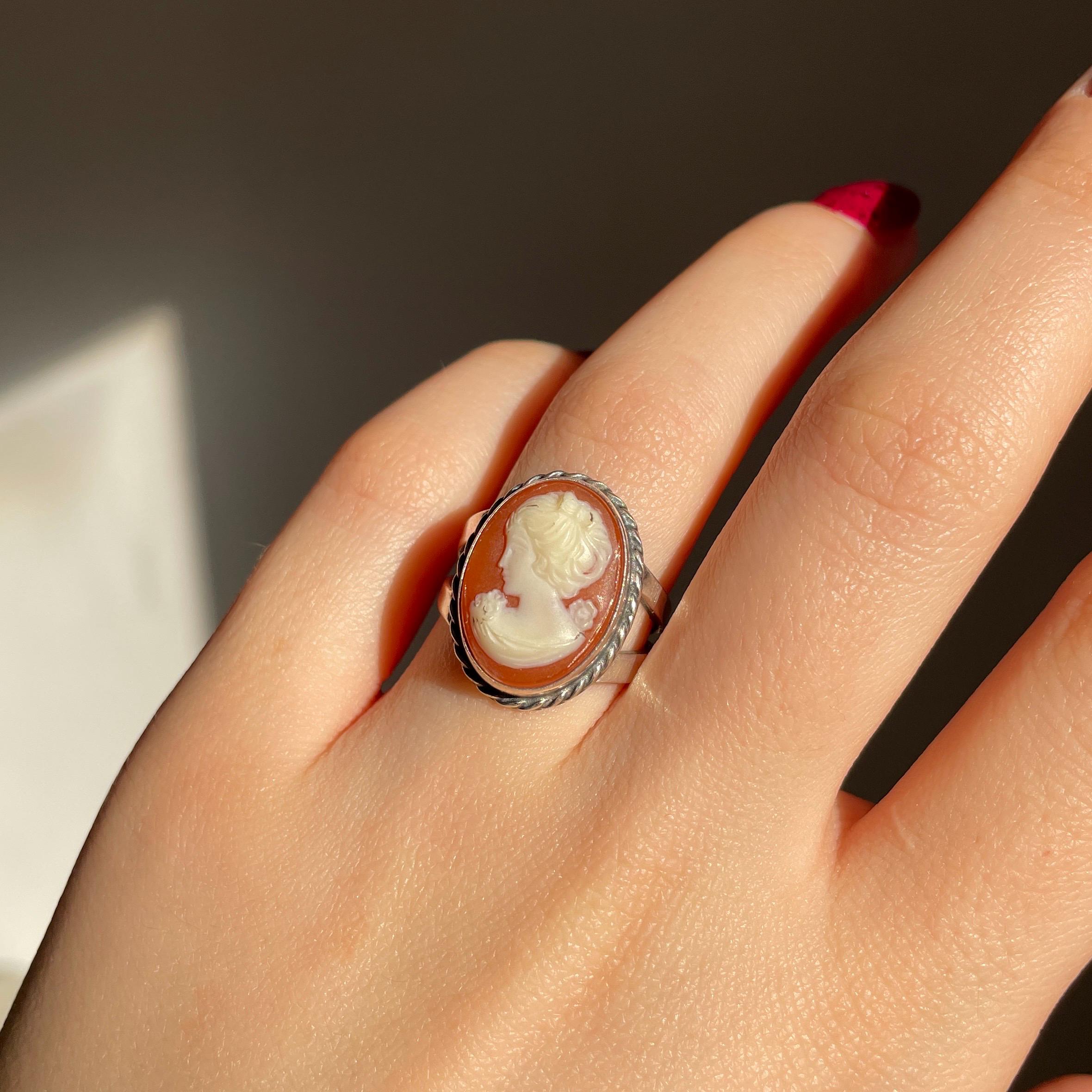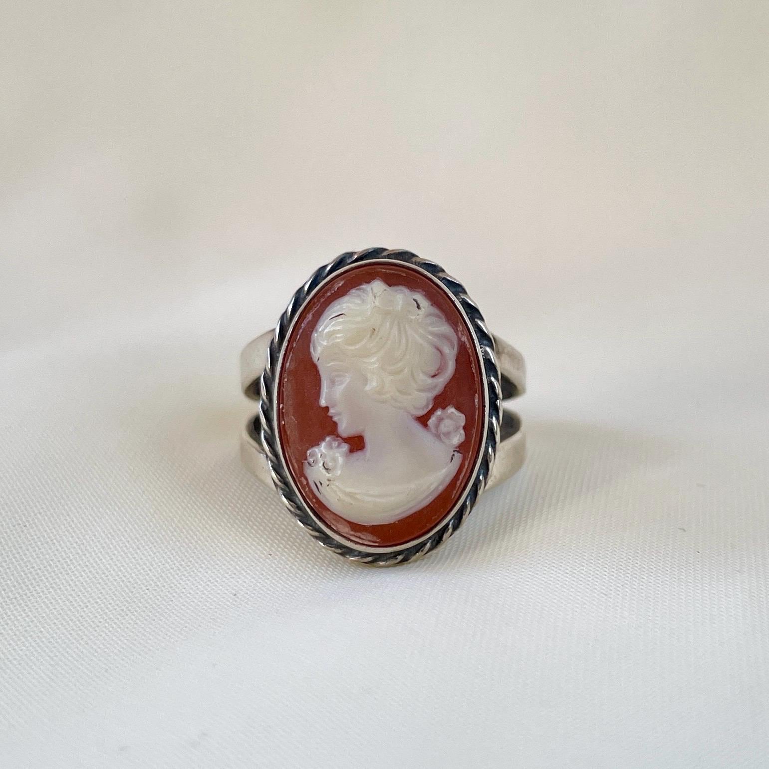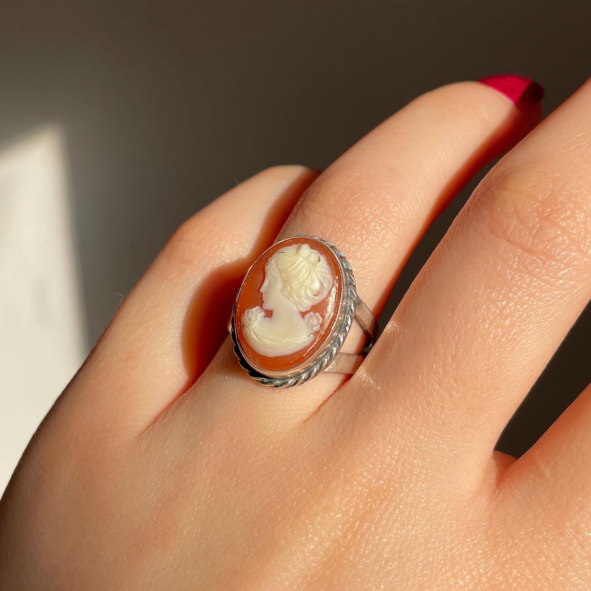 This vintage inspired 925 Sterling Silver Cameo ring of elegant lady portrait is purely handmade. The dimensions of the ring are 0.6 x 0.8 inches. ("925" stamp is on the back of the band)