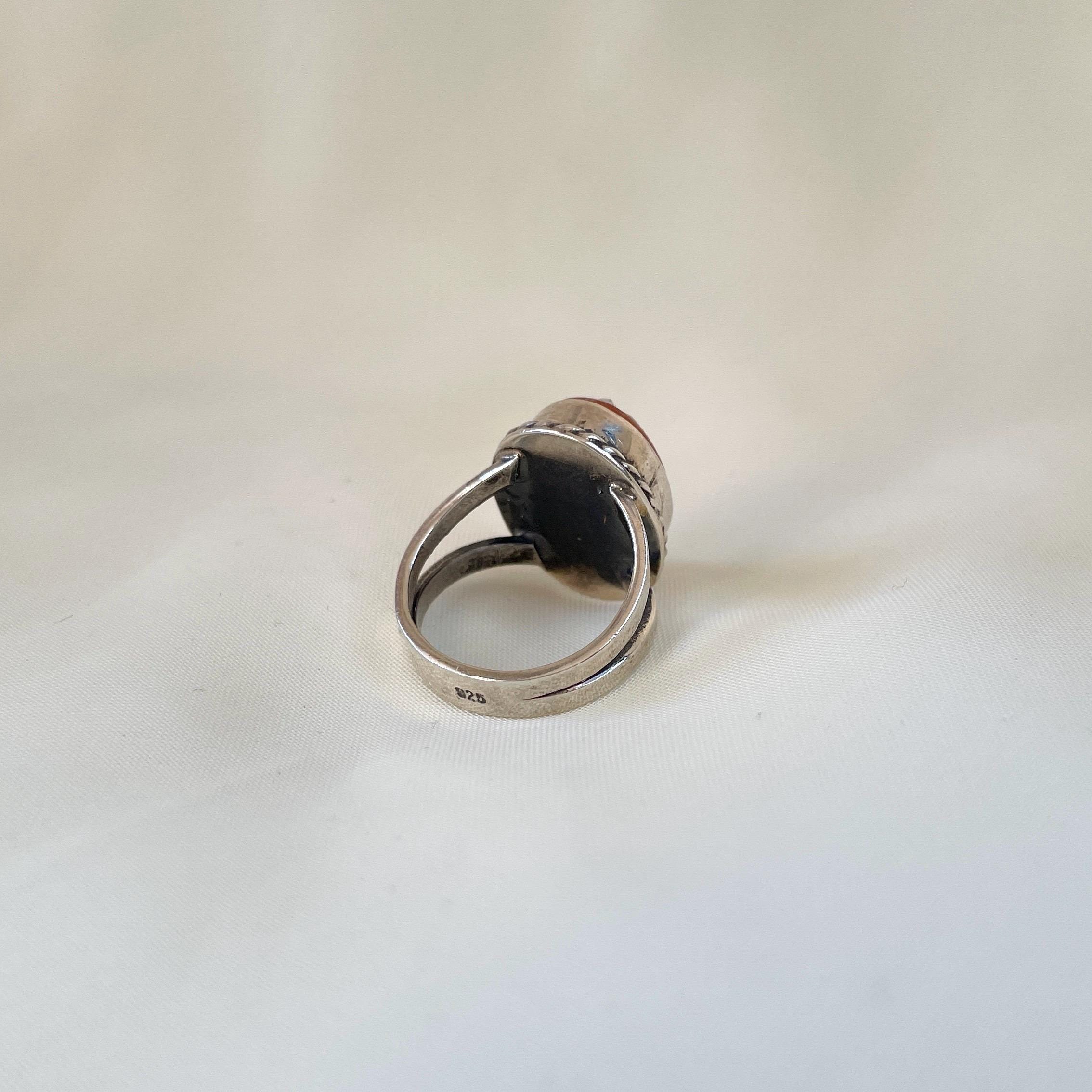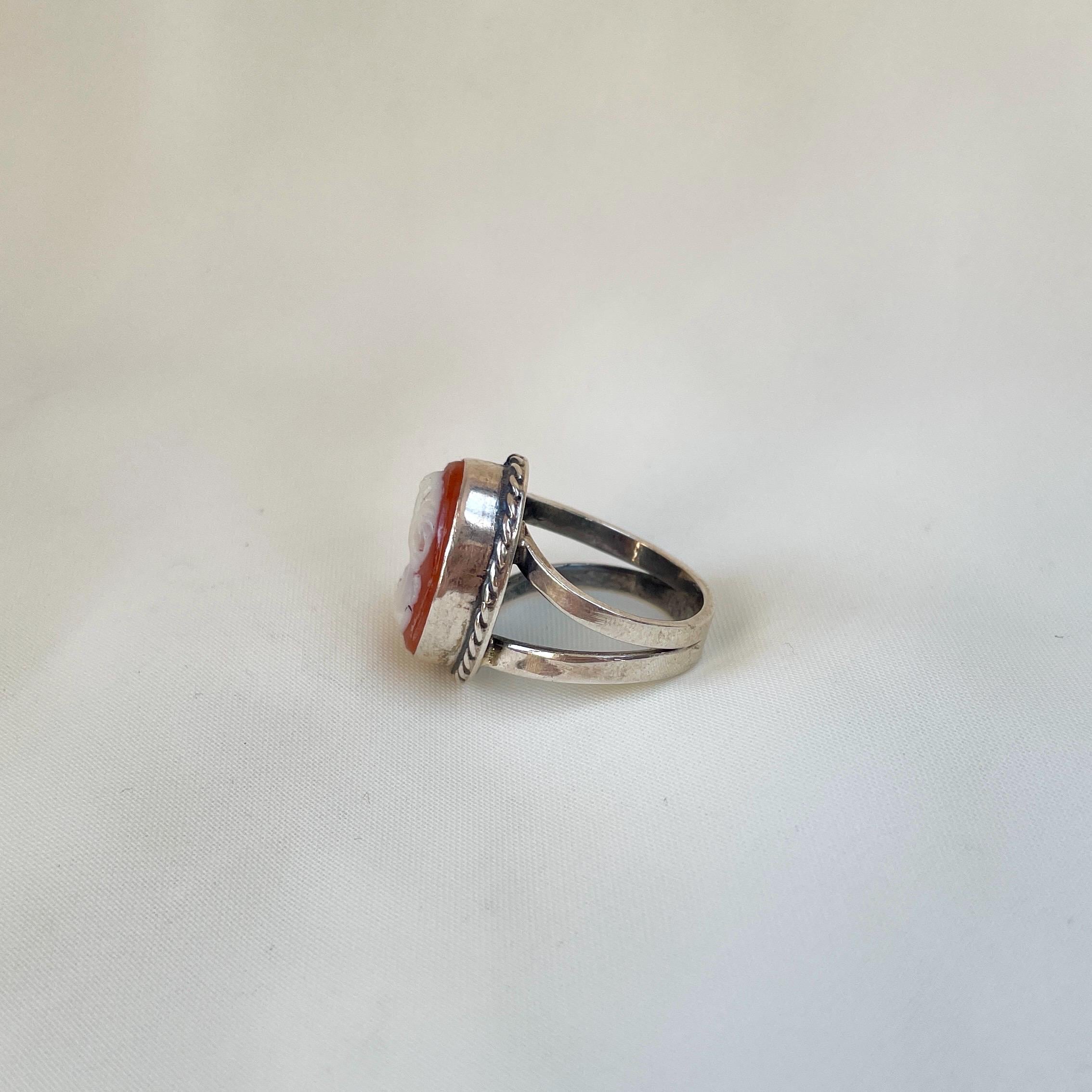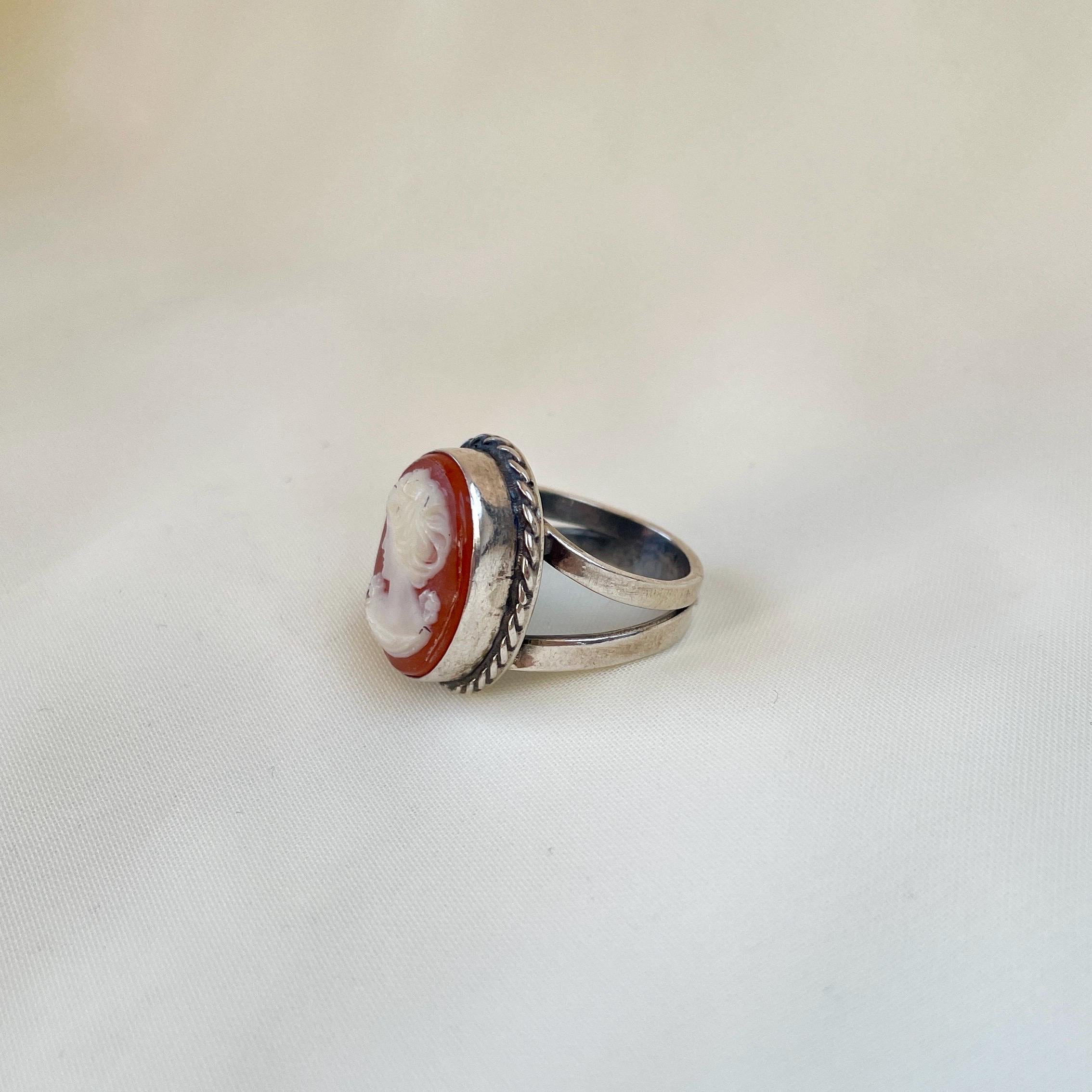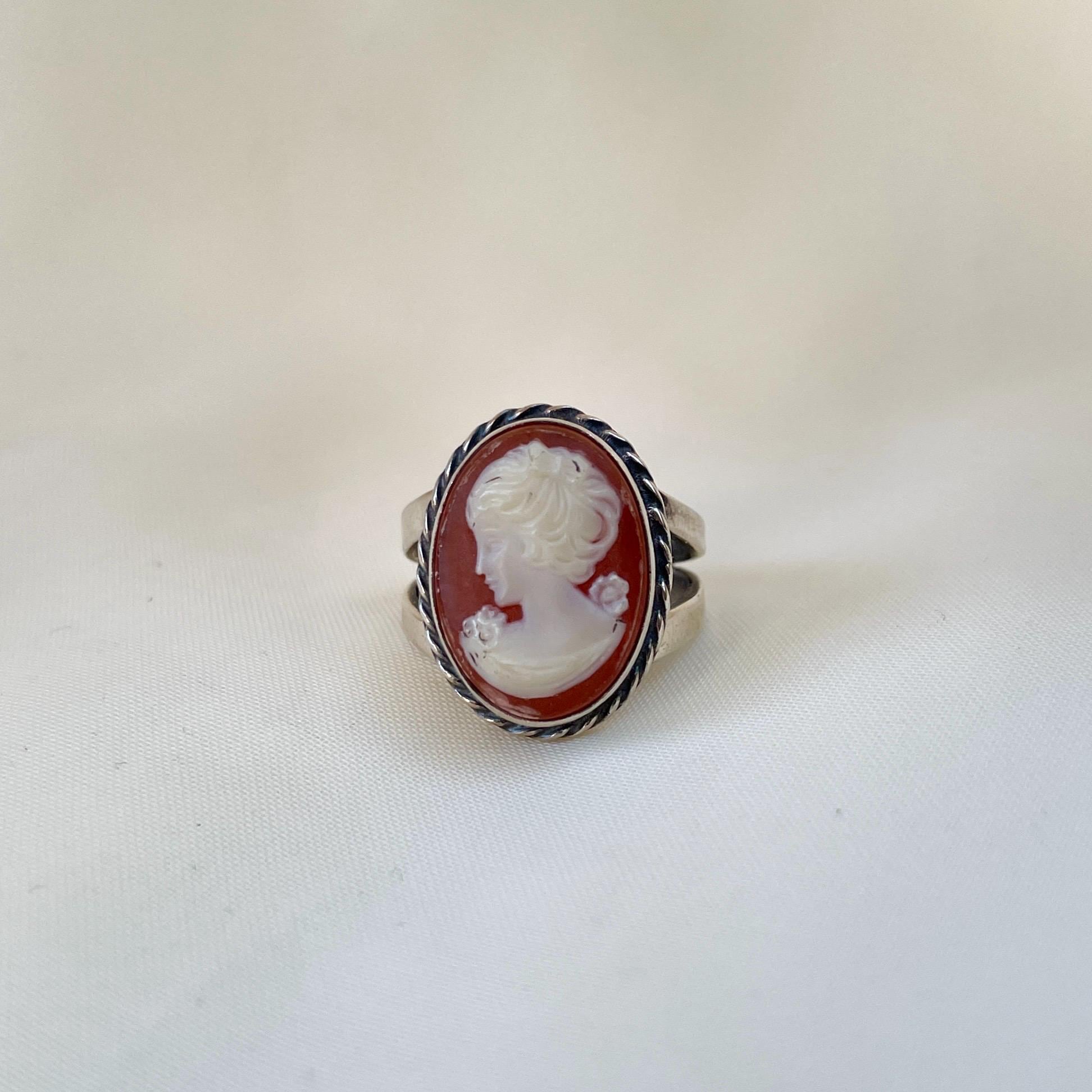 This vintage inspired 925 Sterling Silver Cameo ring of elegant lady portrait is purely handmade. The dimensions of the ring are 0.6 x 0.8 inches. ("925" stamp is on the back of the band)