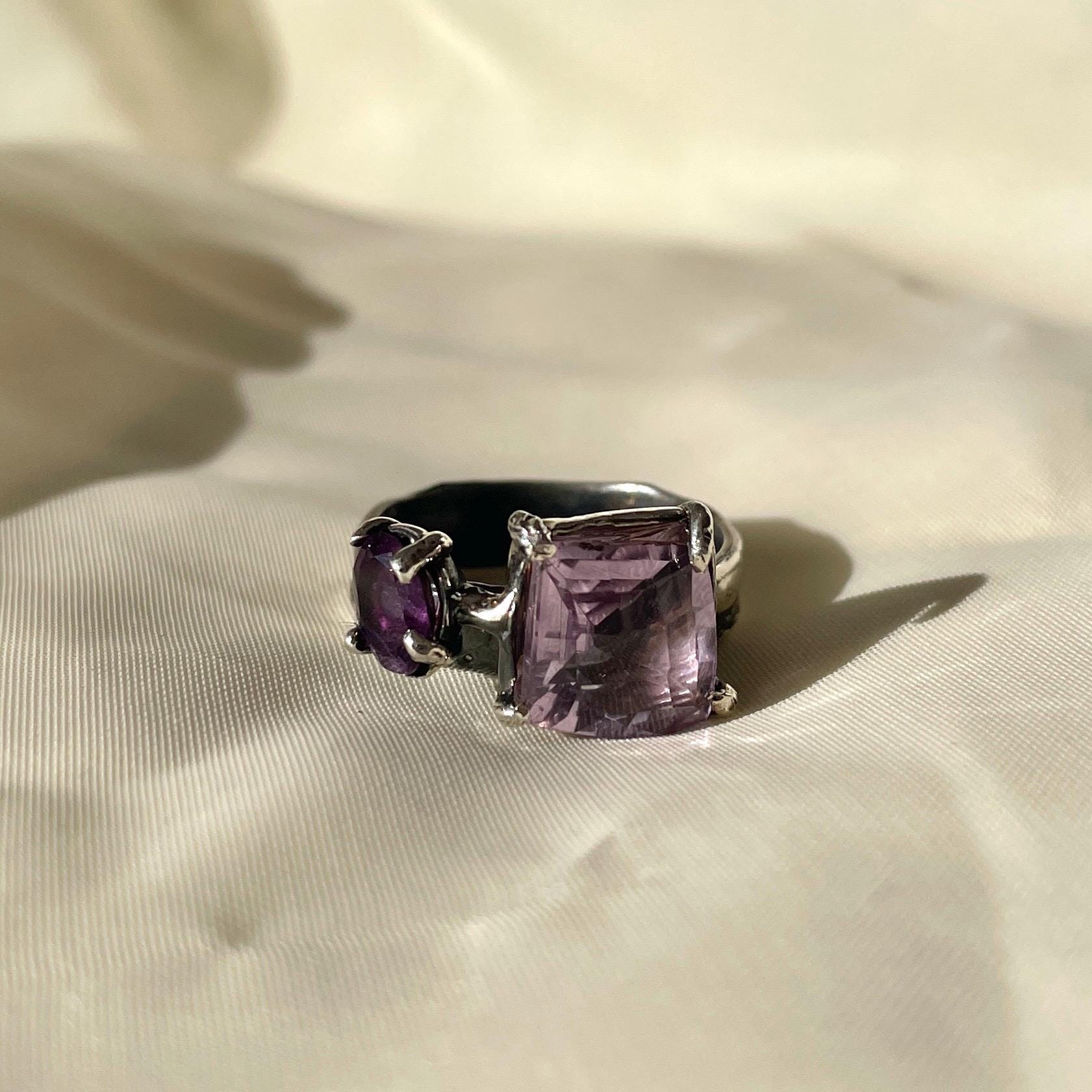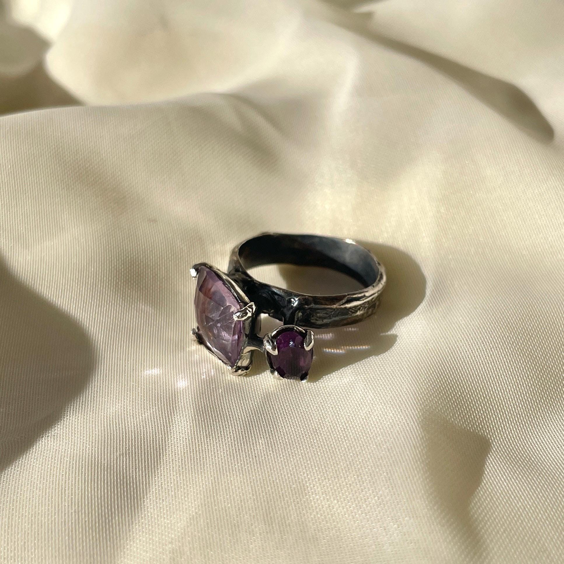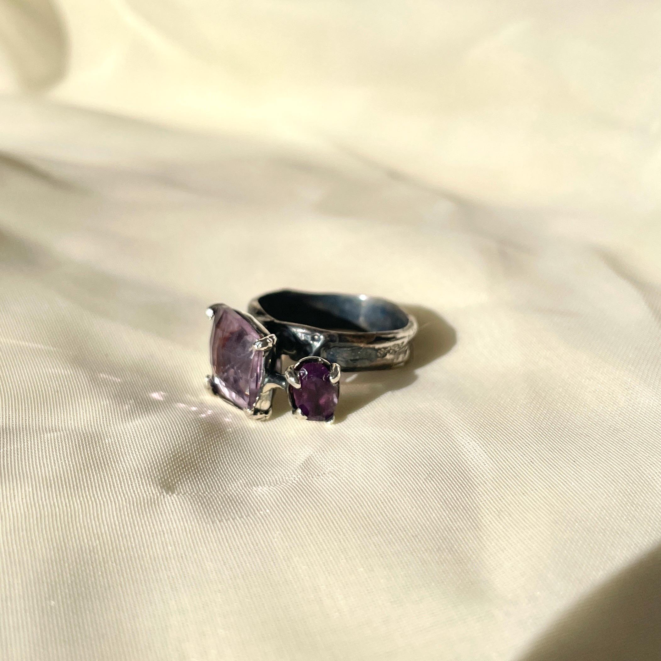 This handmade sterling silver ring features two natural amethysts in different shades of purple, symbolizing harmony between individuality and connection. Each stone carries its own depth and character, yet together they create a perfect balance — just like two souls meeting in the same rhythm.