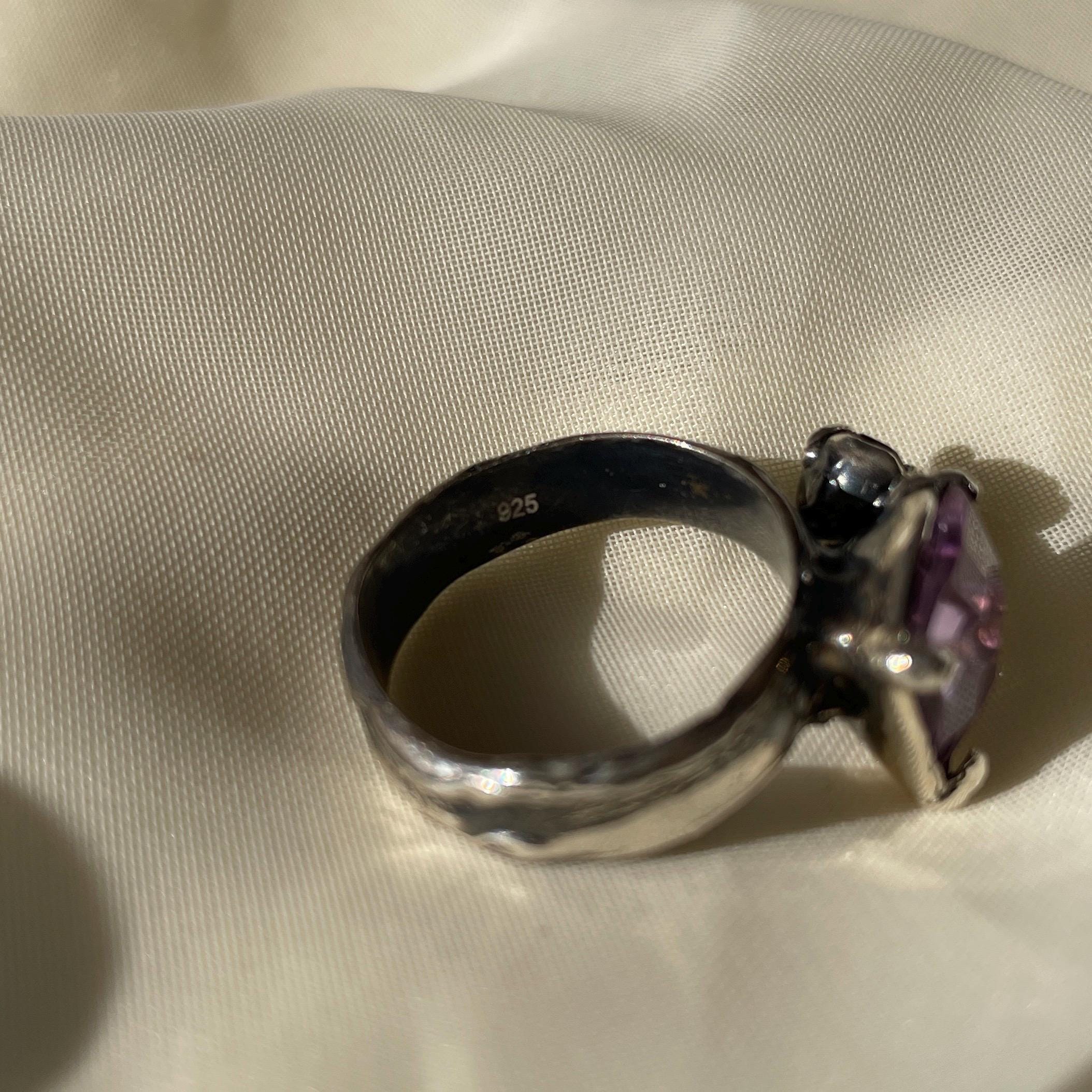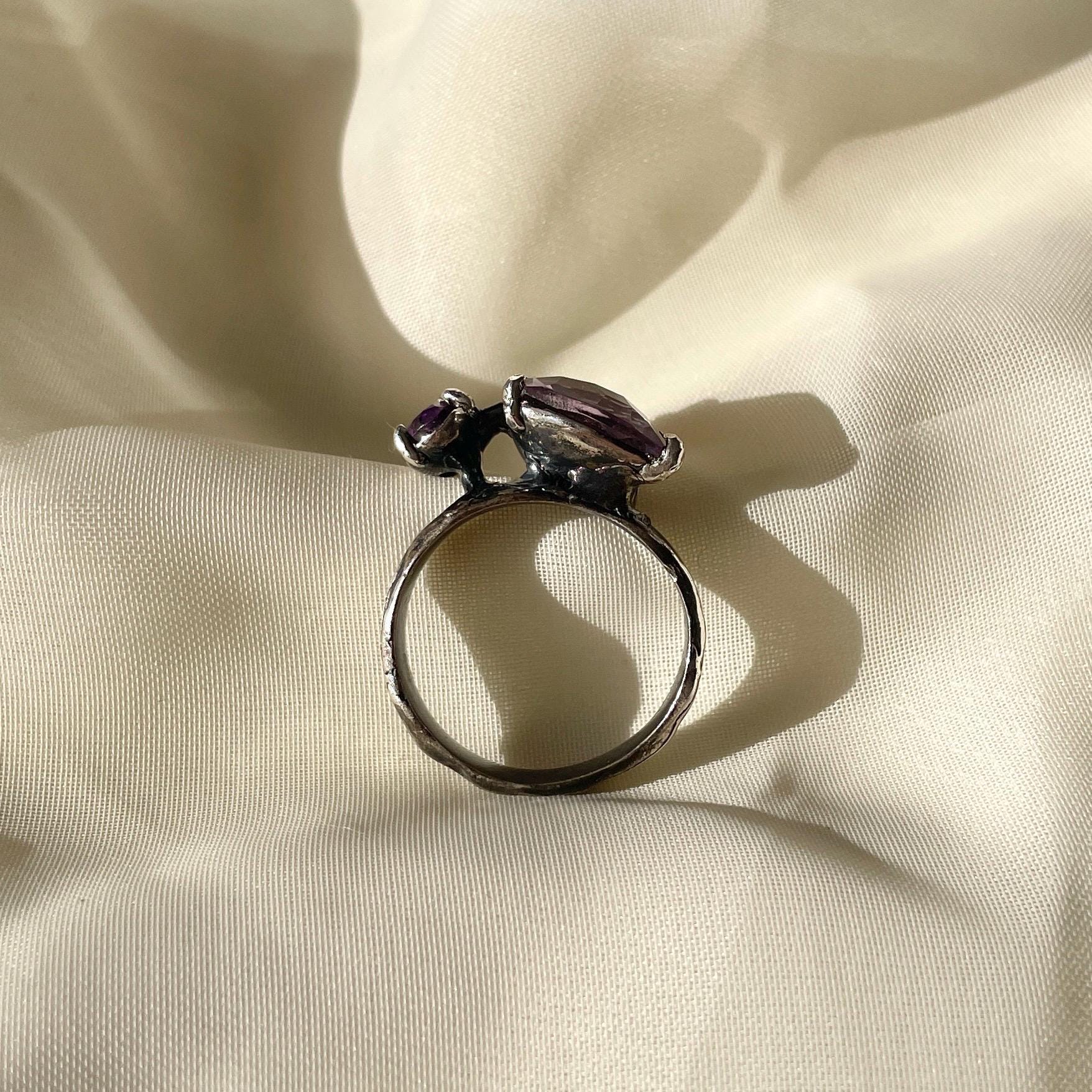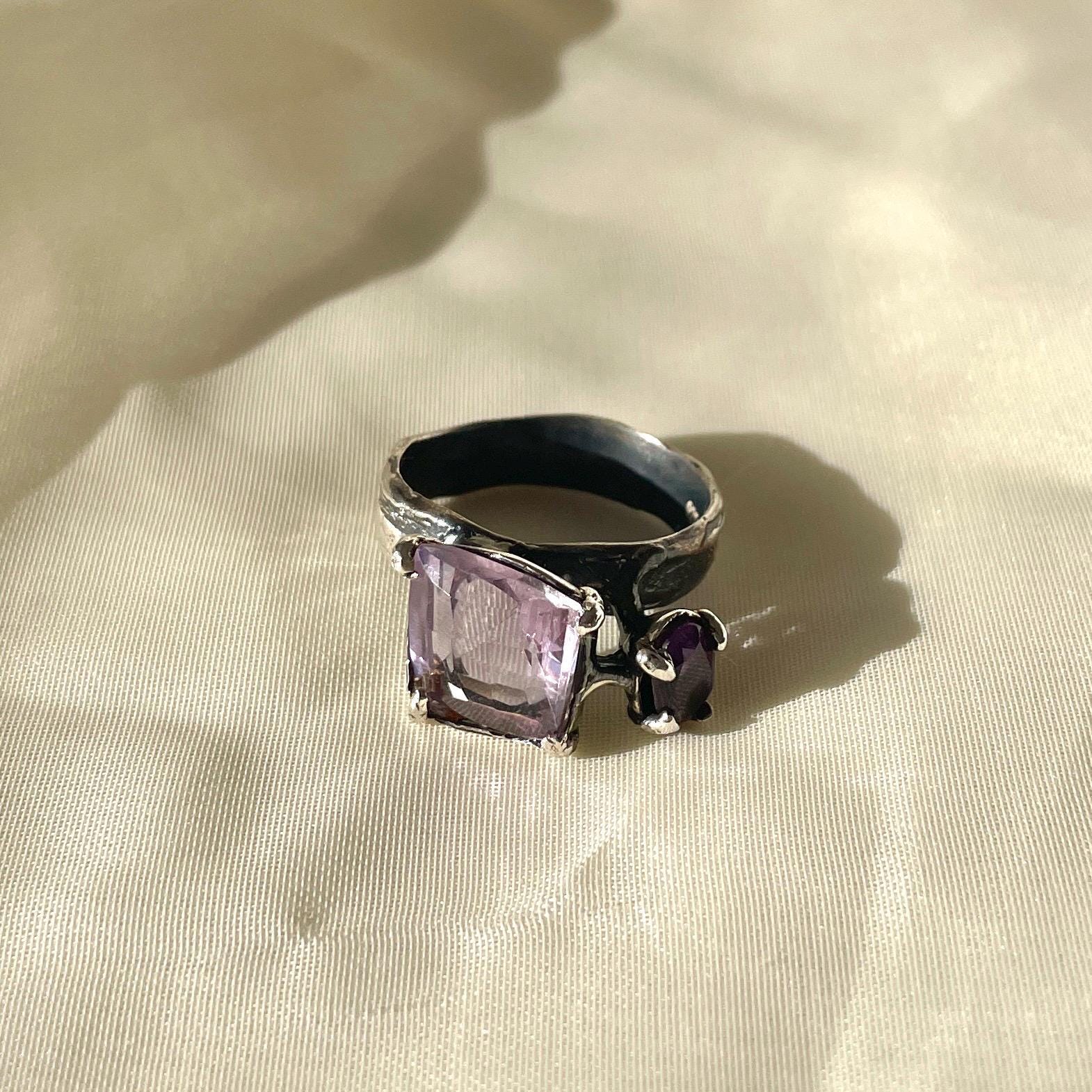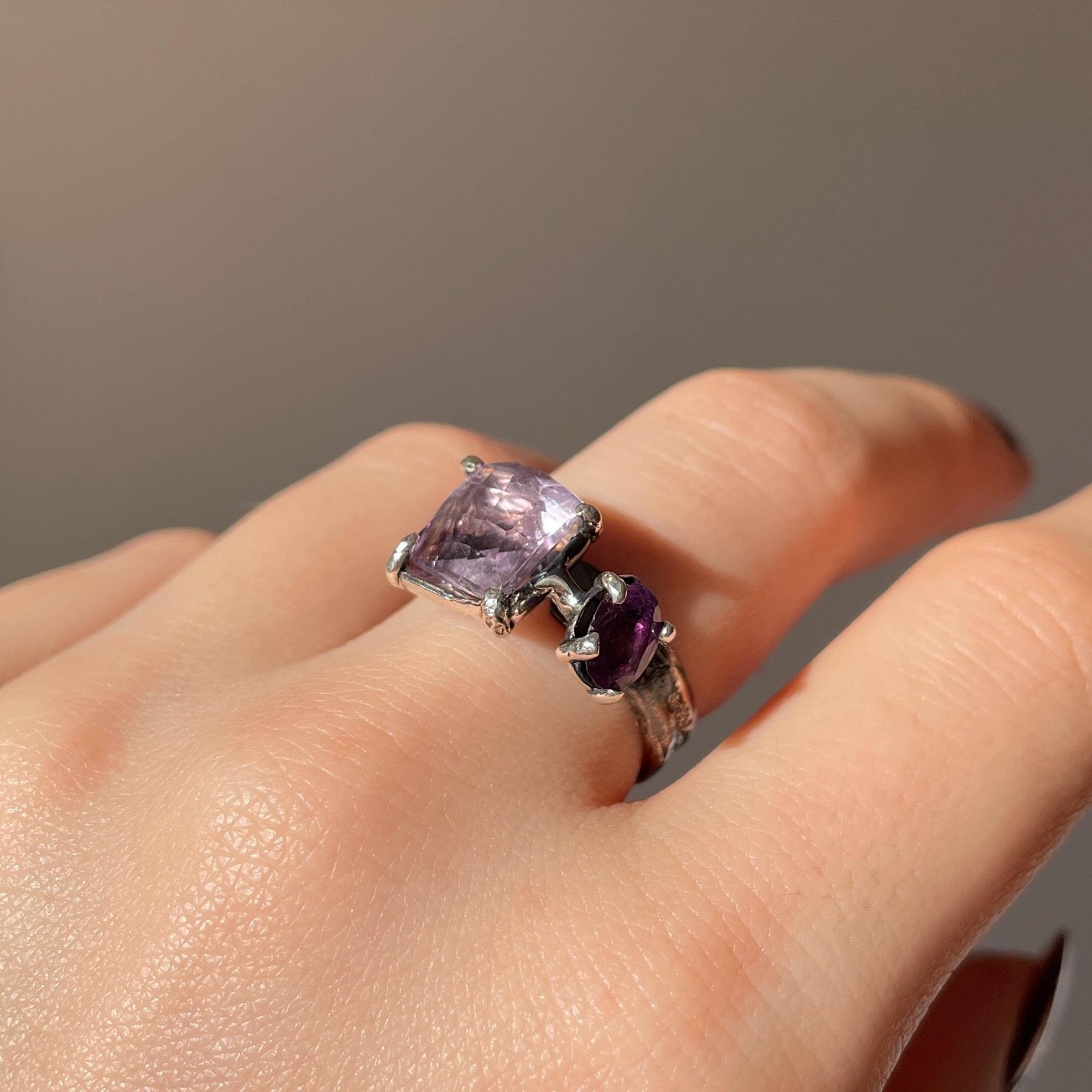 This handmade sterling silver ring features two natural amethysts in different shades of purple, symbolizing harmony between individuality and connection. Each stone carries its own depth and character, yet together they create a perfect balance — just like two souls meeting in the same rhythm.