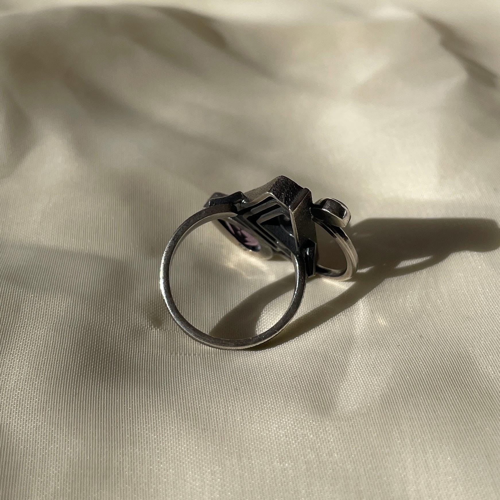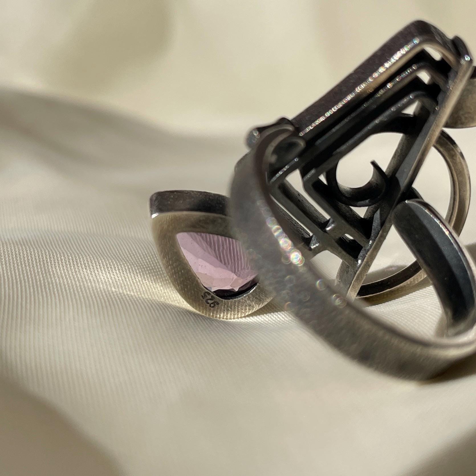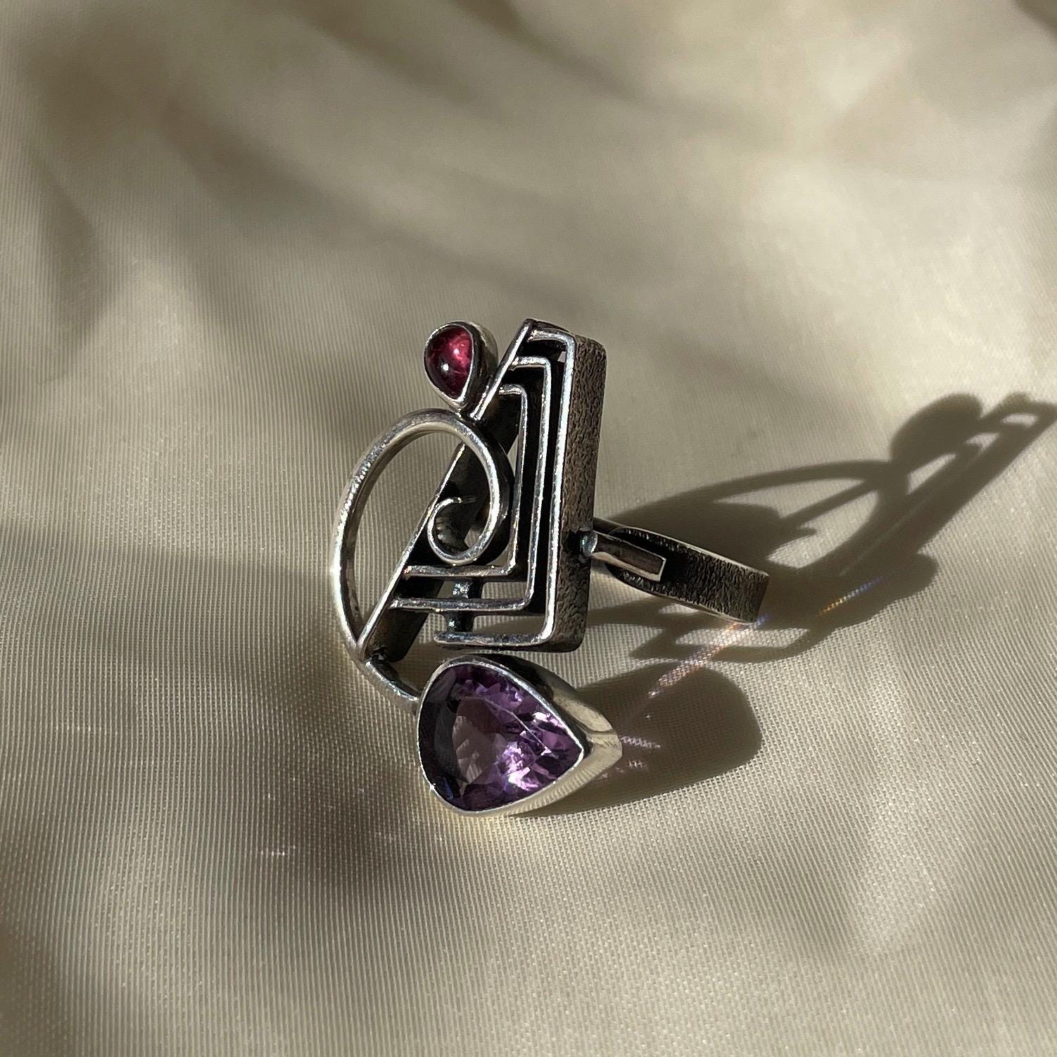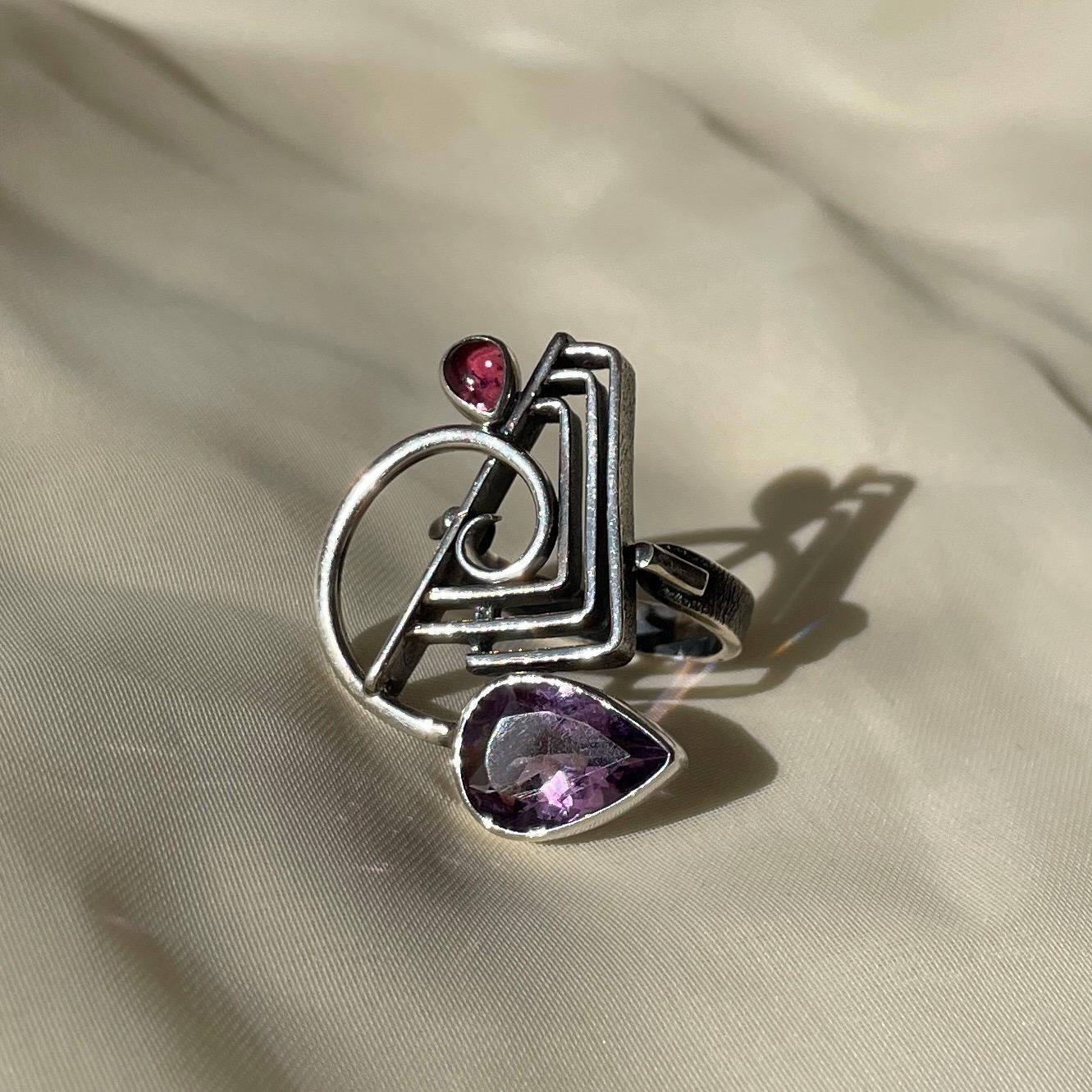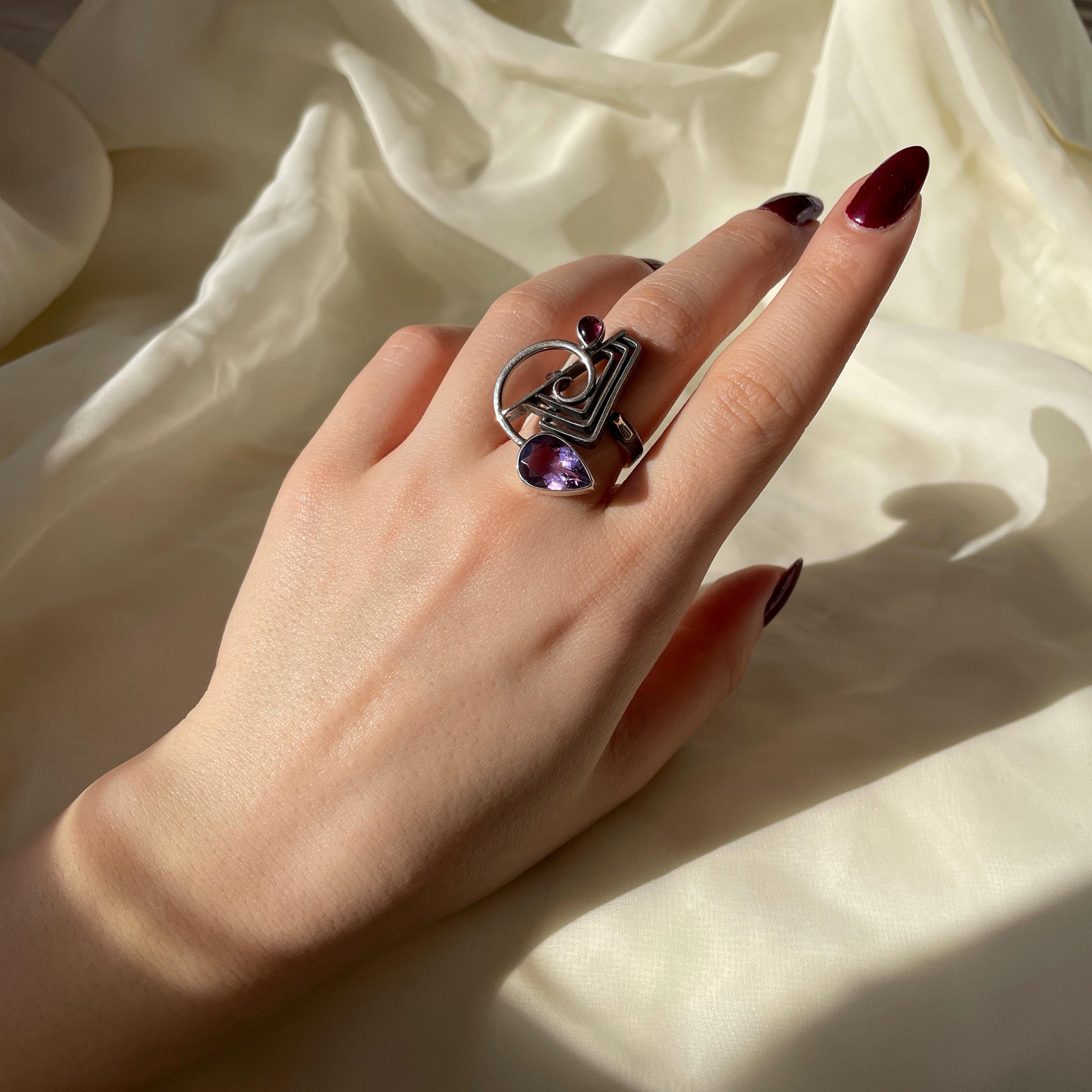 This handmade geometric ring is a bold expression of balance, emotion, and individuality. Crafted in solid 925 sterling silver with an oxidized, rough finish, it features two natural gemstones — a deep purple amethyst and a vibrant pink tourmaline — creating a striking contrast of energy and color.