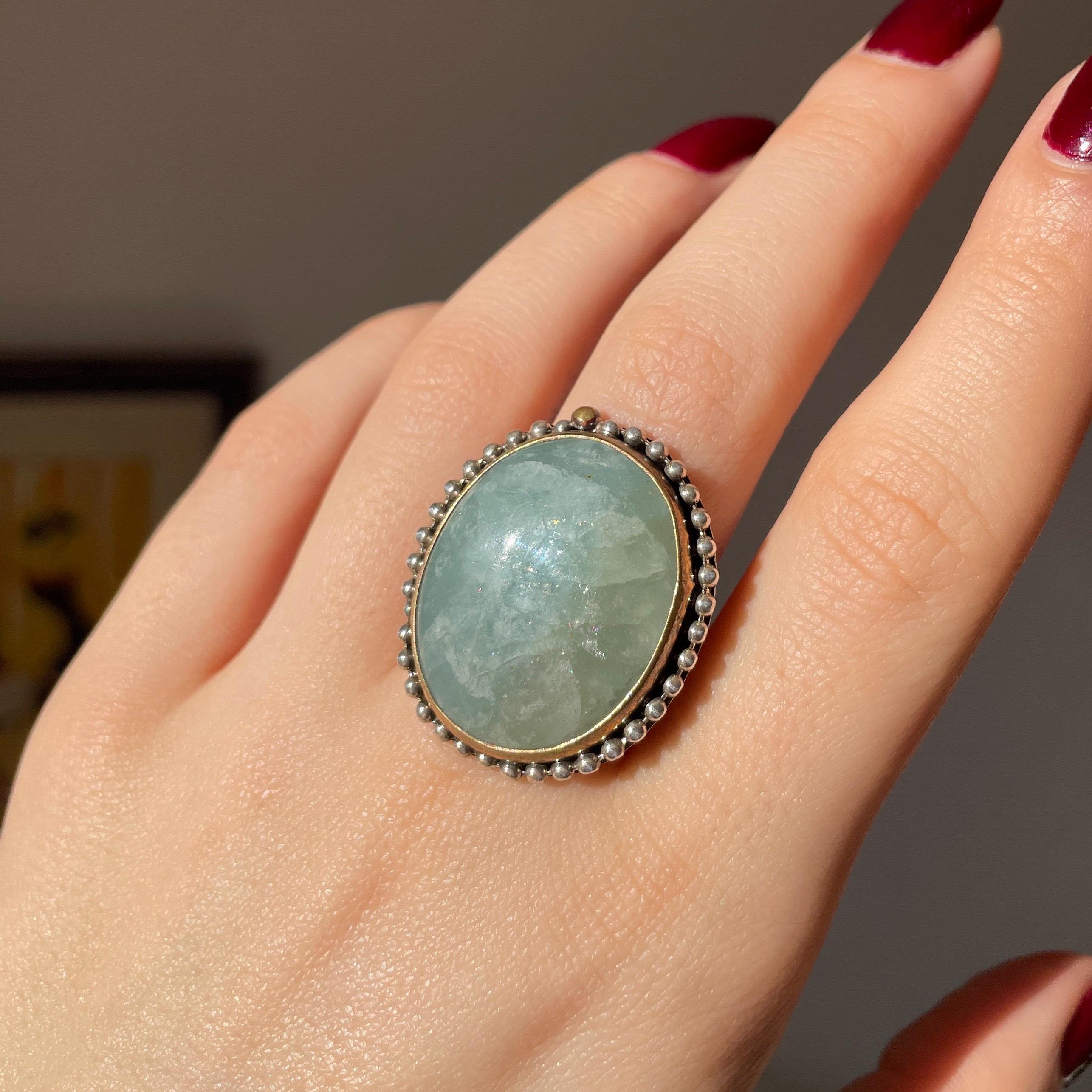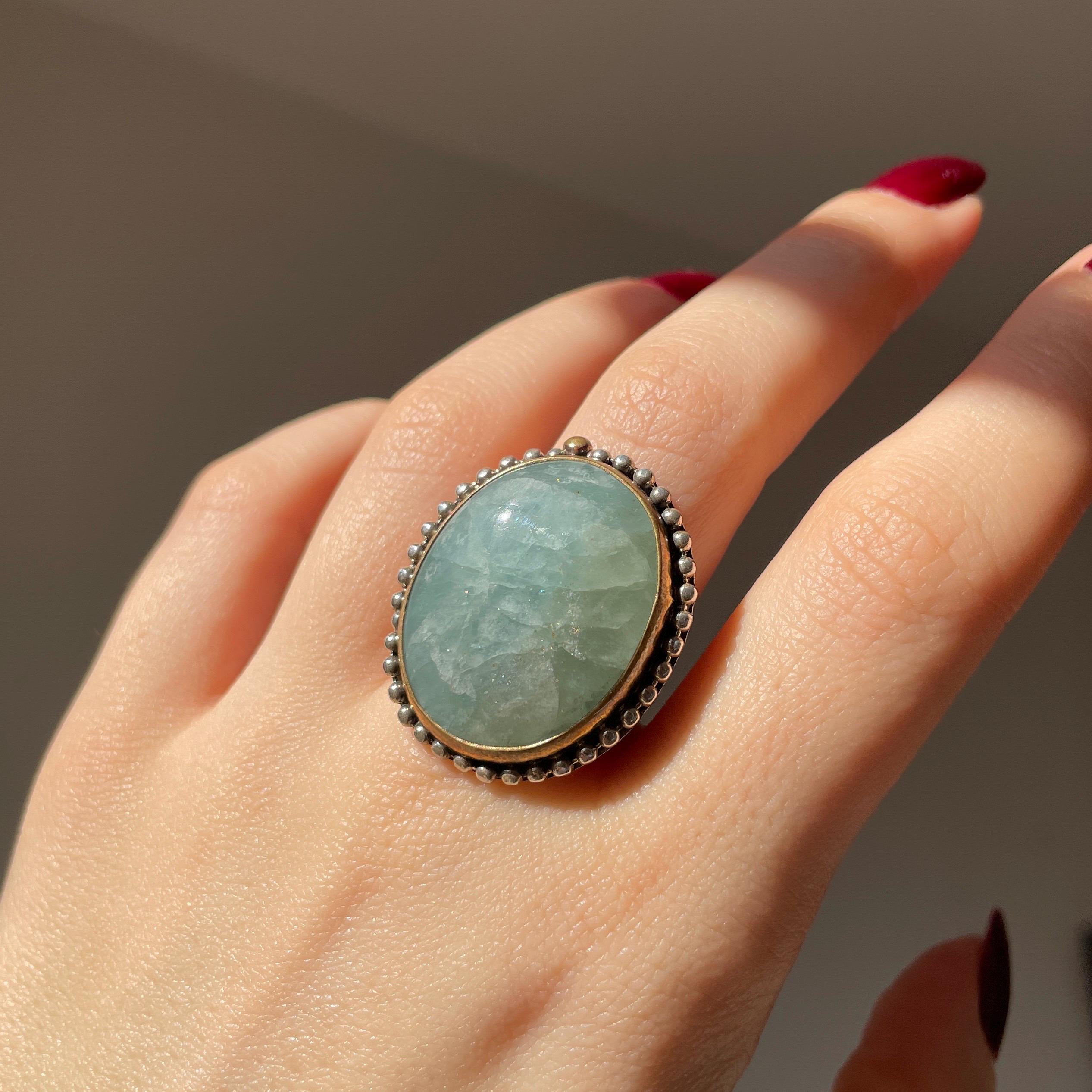 This ring features an oval Aquamarine, framed by a warm bronze bezel and set in solid sterling silver.