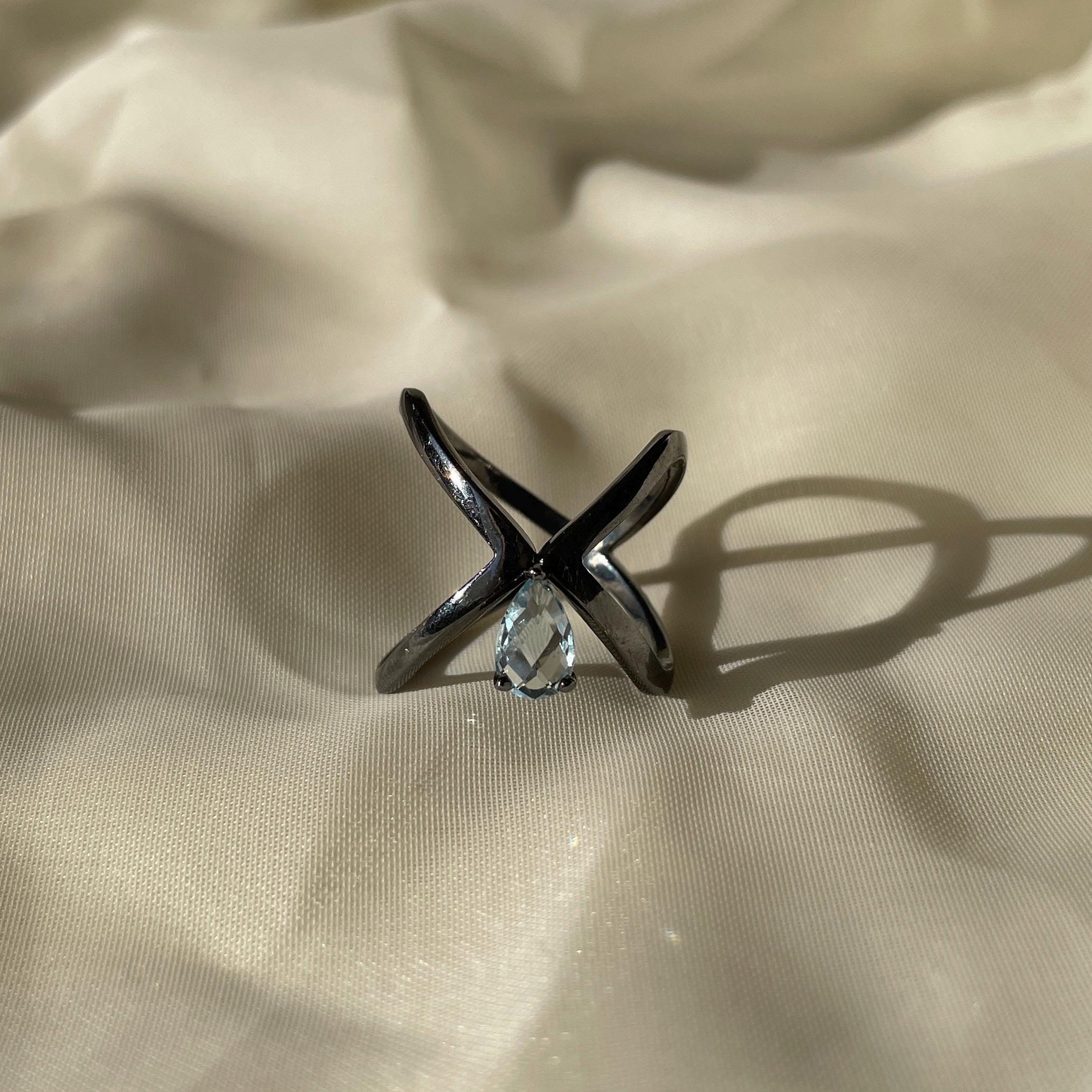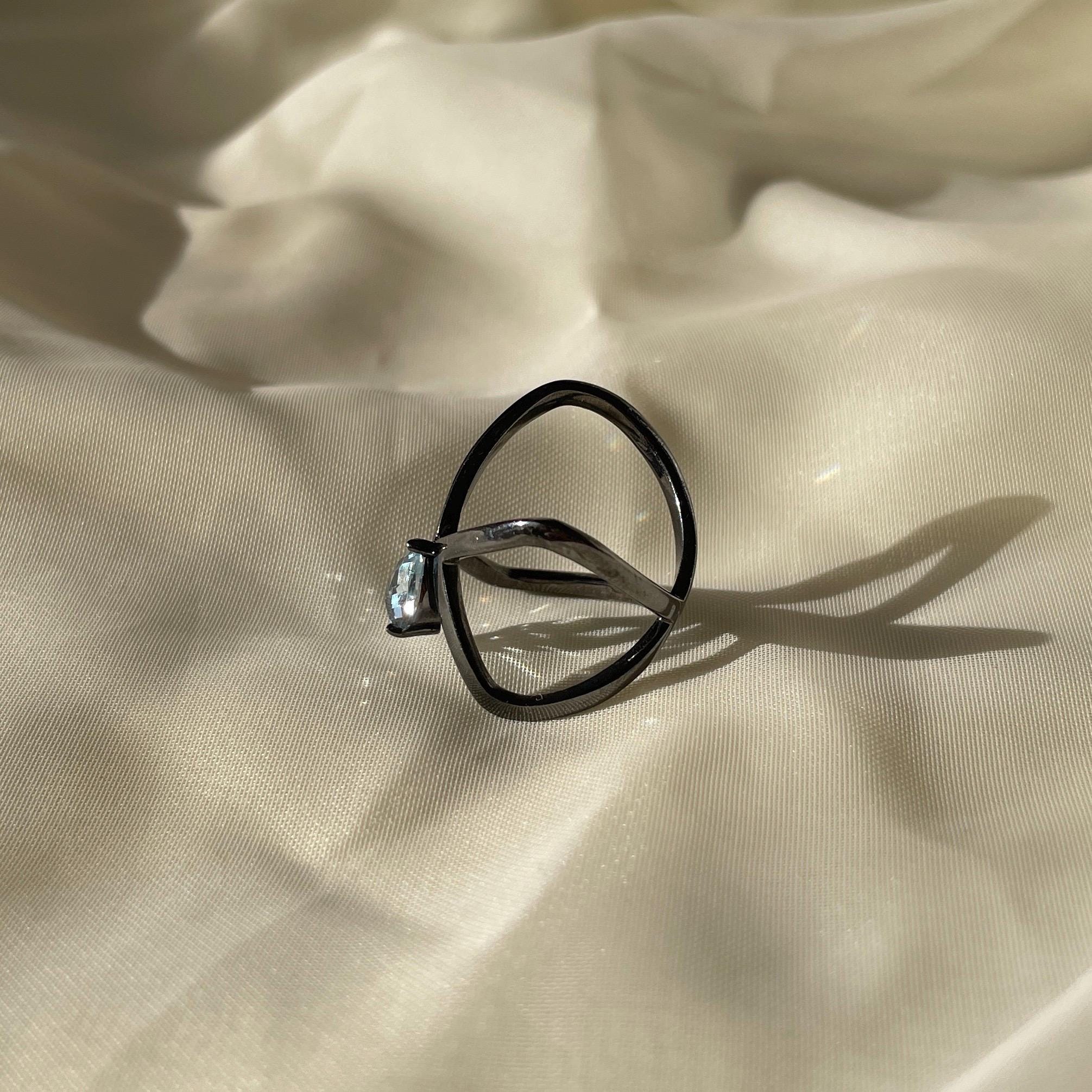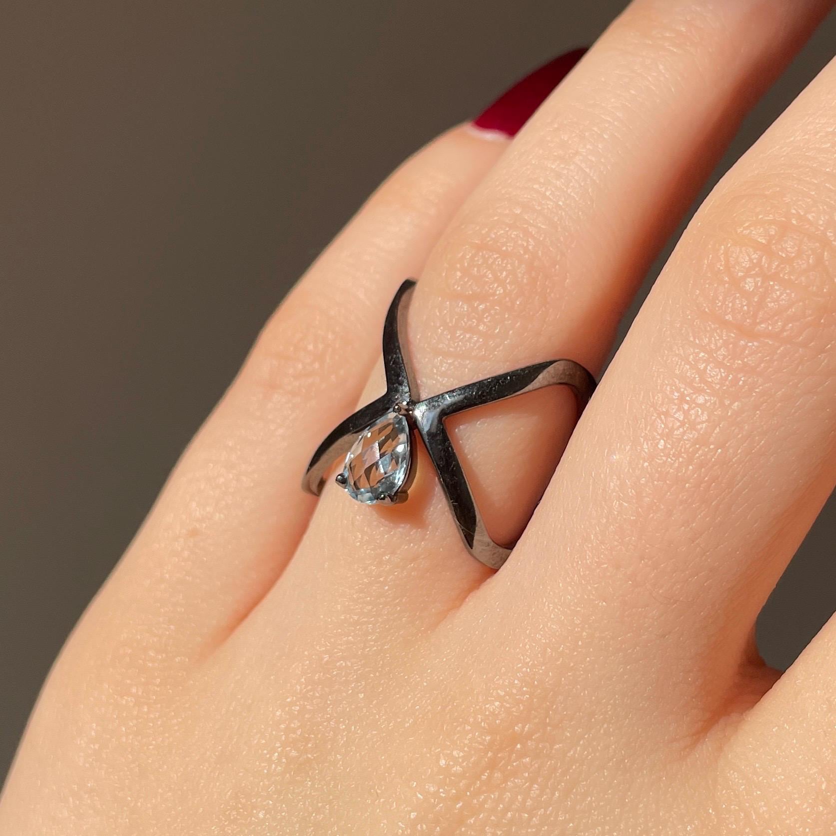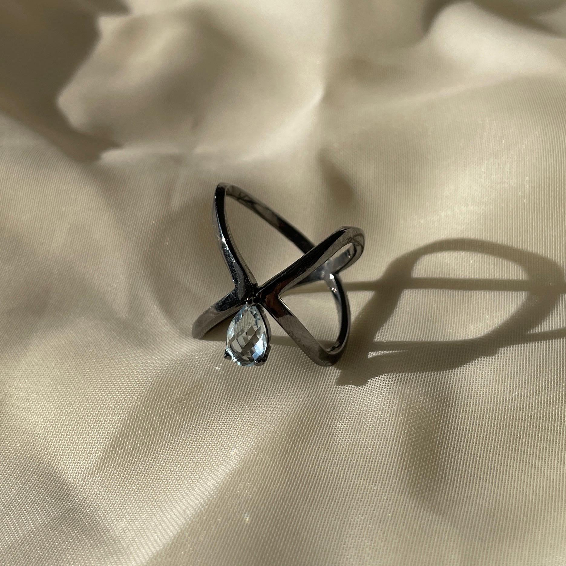 This ring features a luminous Blue Topaz set in black rhodium plated sterling silver, creating a striking contrast between light and shadow. Its sculptural, open form feels modern, bold, and effortlessly elegant.