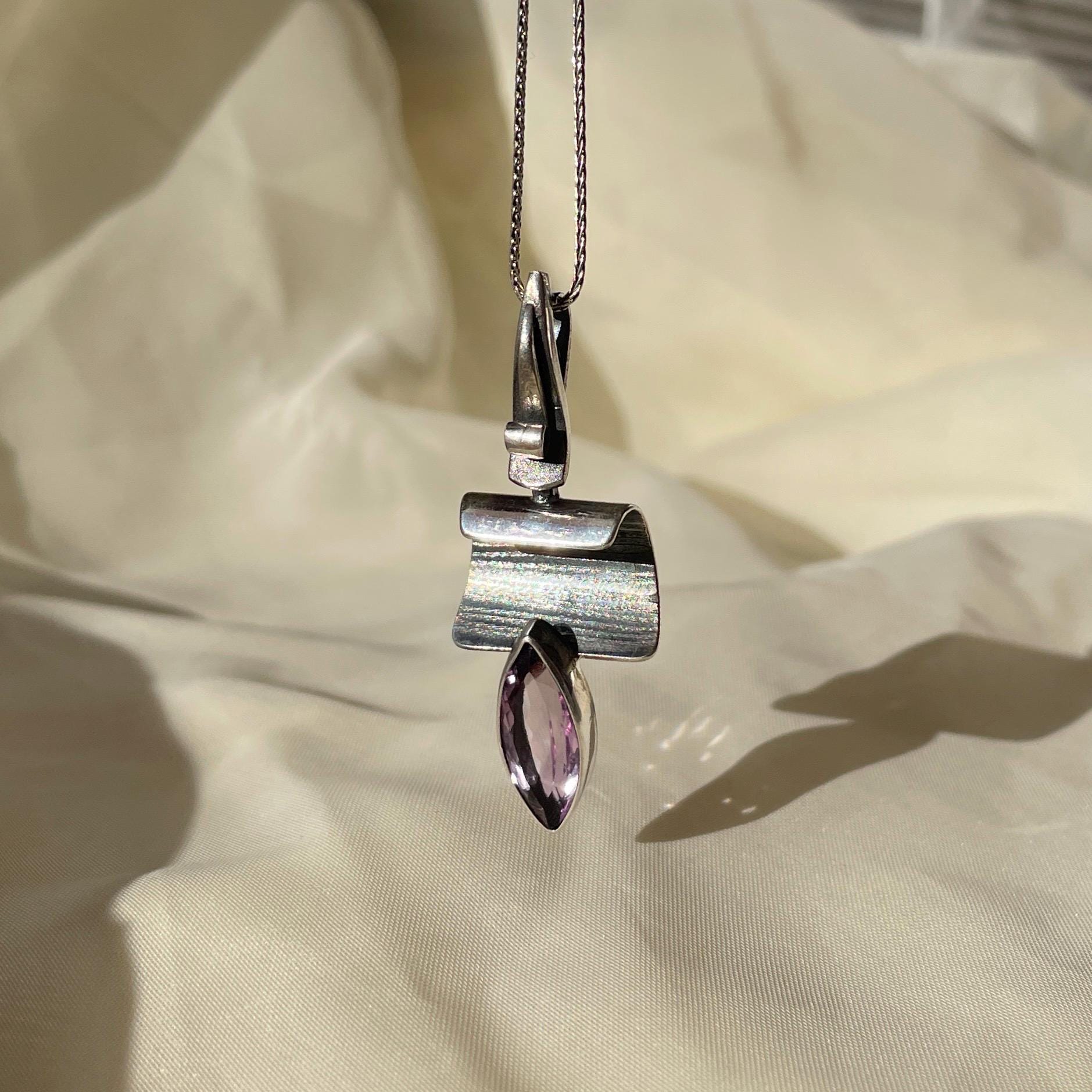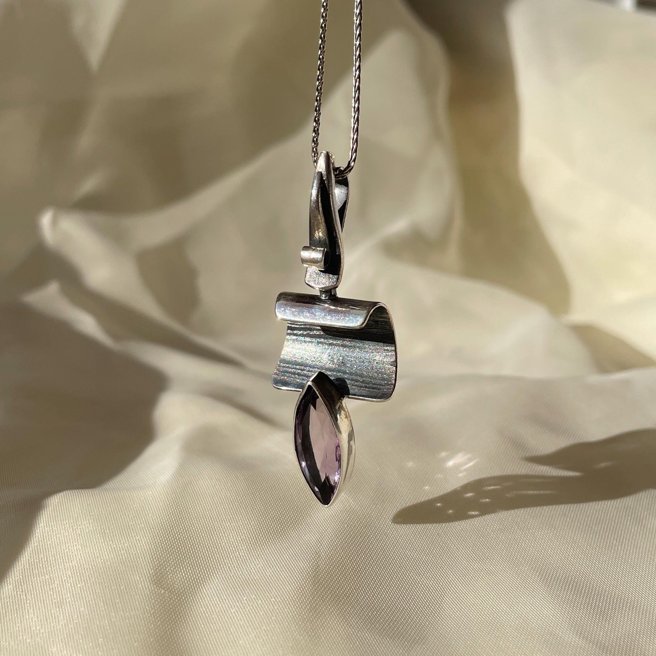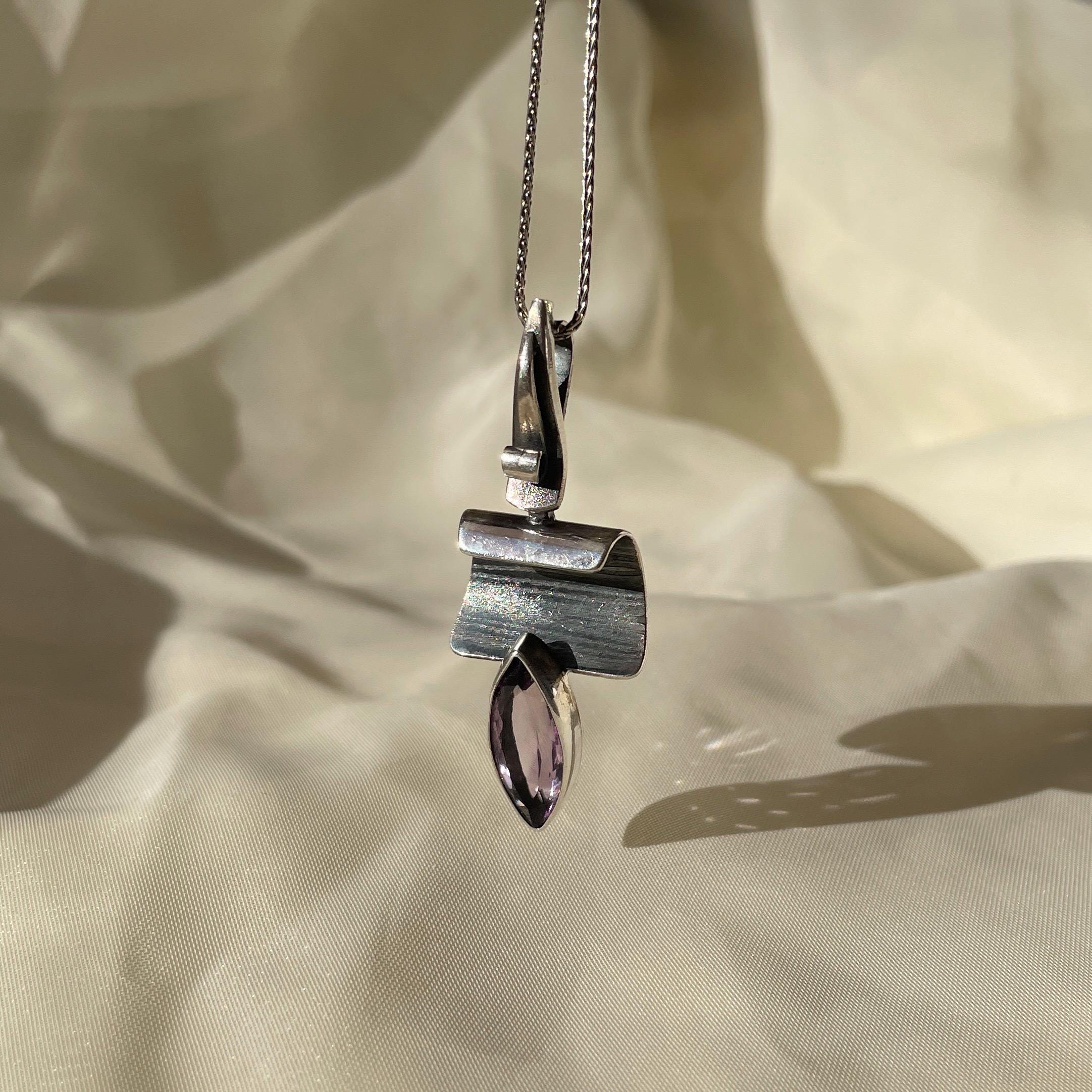This pendant features a marquise cut Lilac Amethyst suspended beneath a sculptural form in solid Sterling Silver, creating a delicate balance between light, movement, and form. Handcrafted in 925 Sterling Silver and hallmarked on the back, it carries both elegance and authenticity.