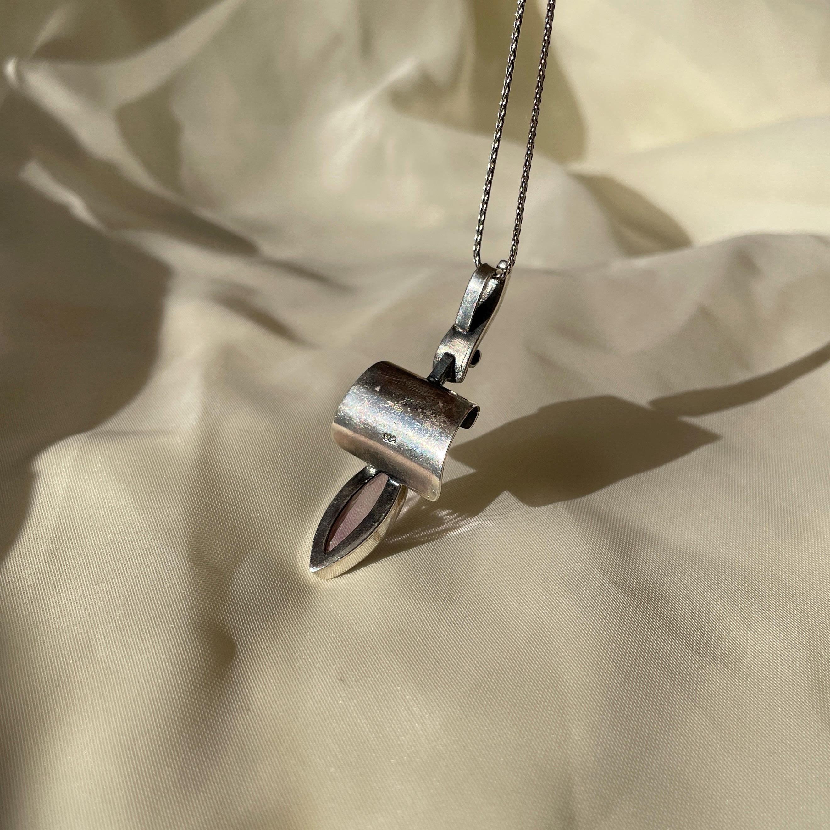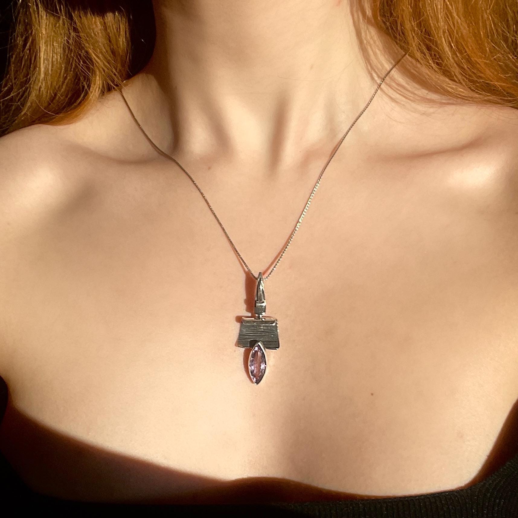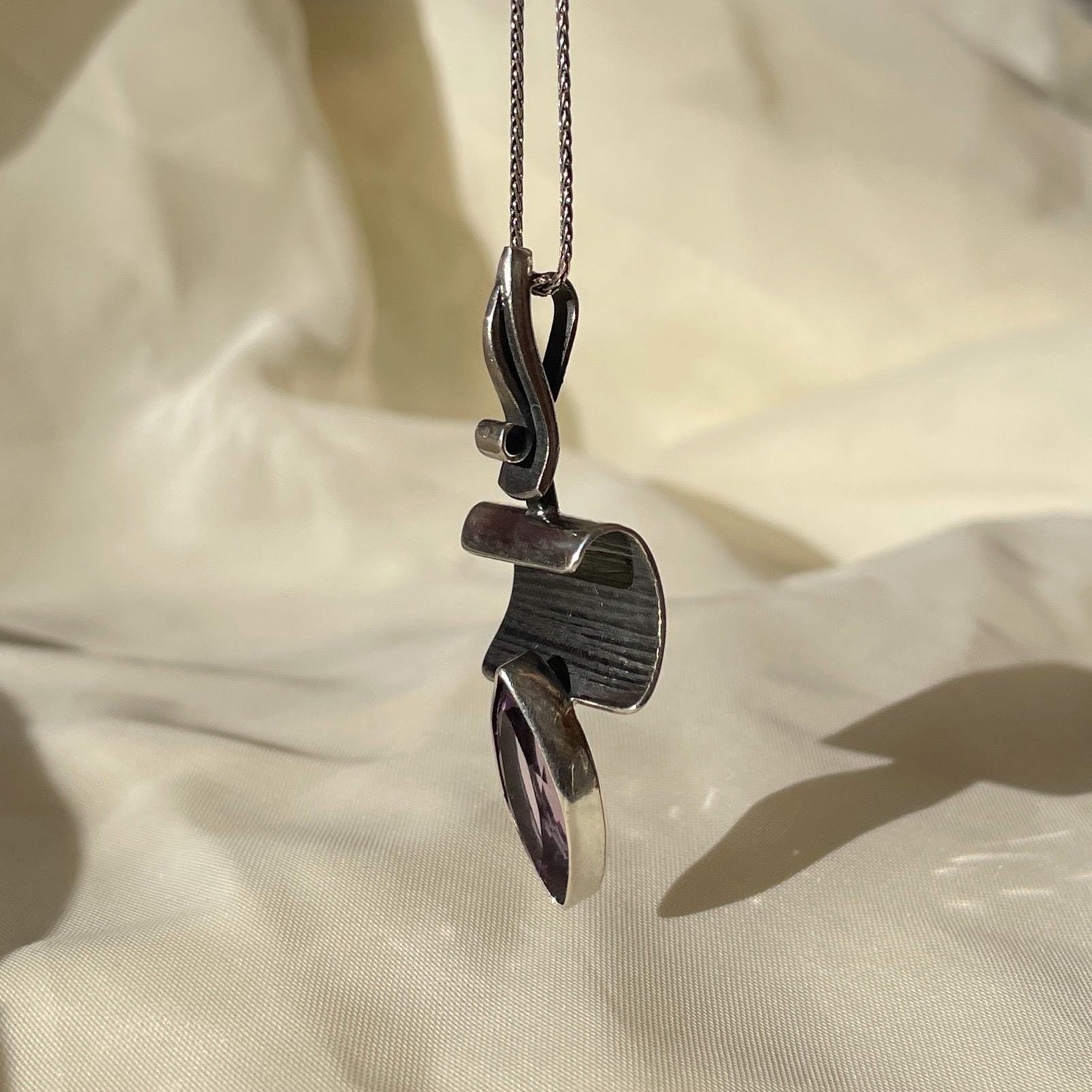 This pendant features a marquise cut Lilac Amethyst suspended beneath a sculptural form in solid Sterling Silver, creating a delicate balance between light, movement, and form. Handcrafted in 925 Sterling Silver and hallmarked on the back, it carries both elegance and authenticity.