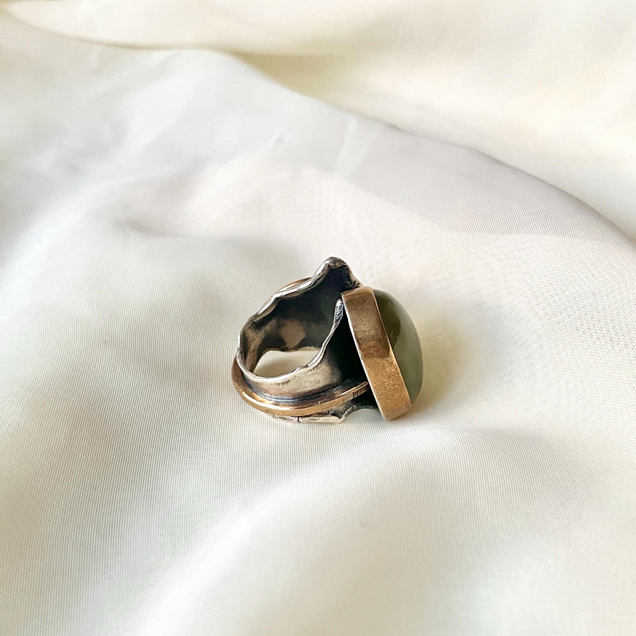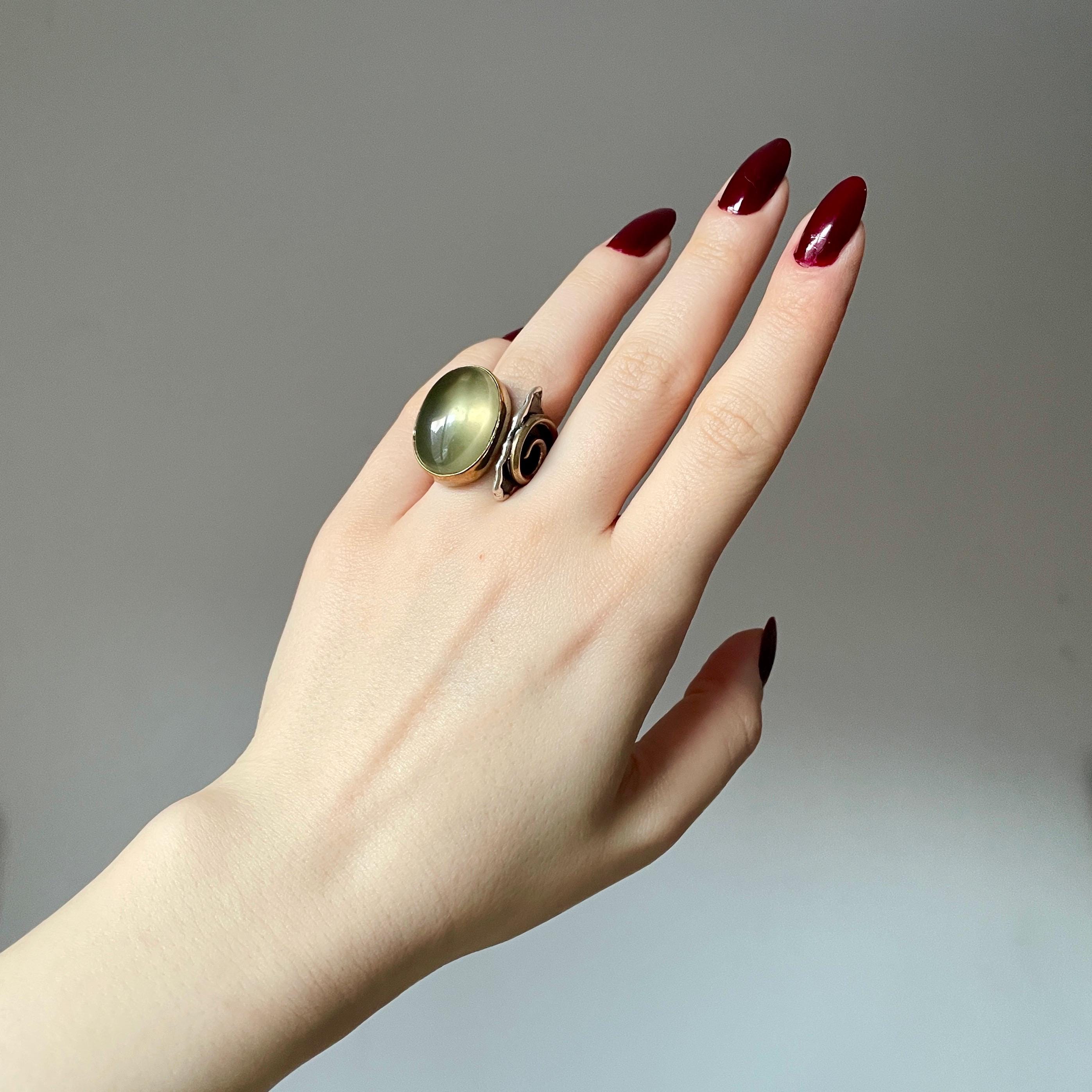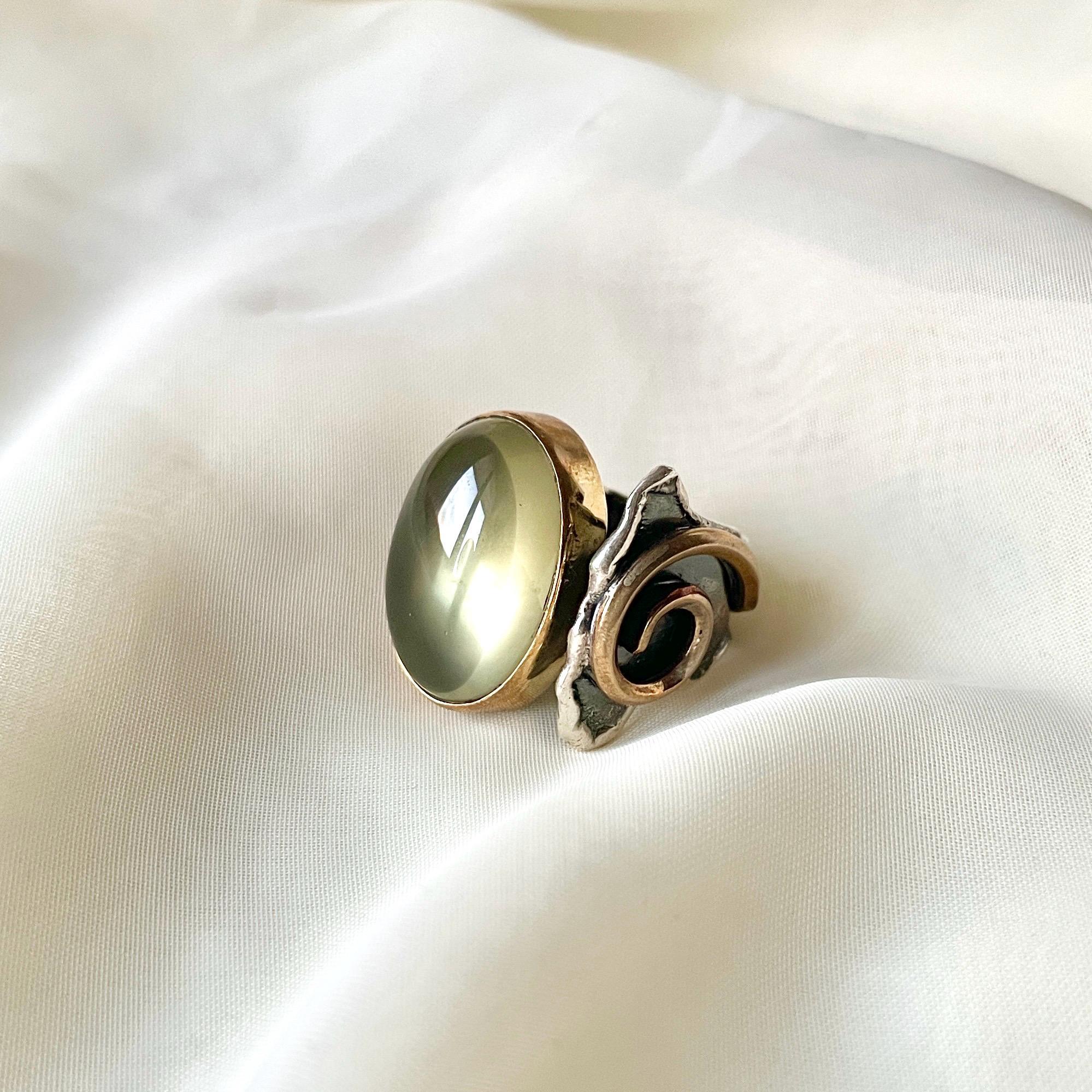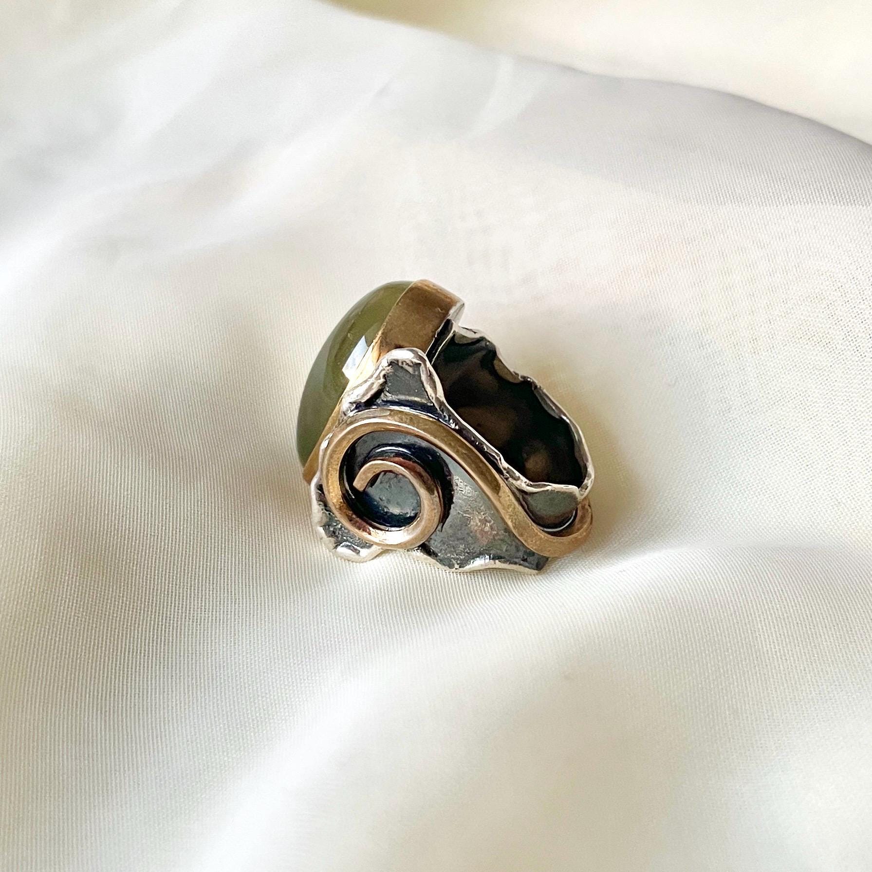 This 925 Sterling Silver adjustable spiral detailed band ring is purely handmade and natural Prehnite is used as gemstone. Bronze metal is used for bezel and side details.