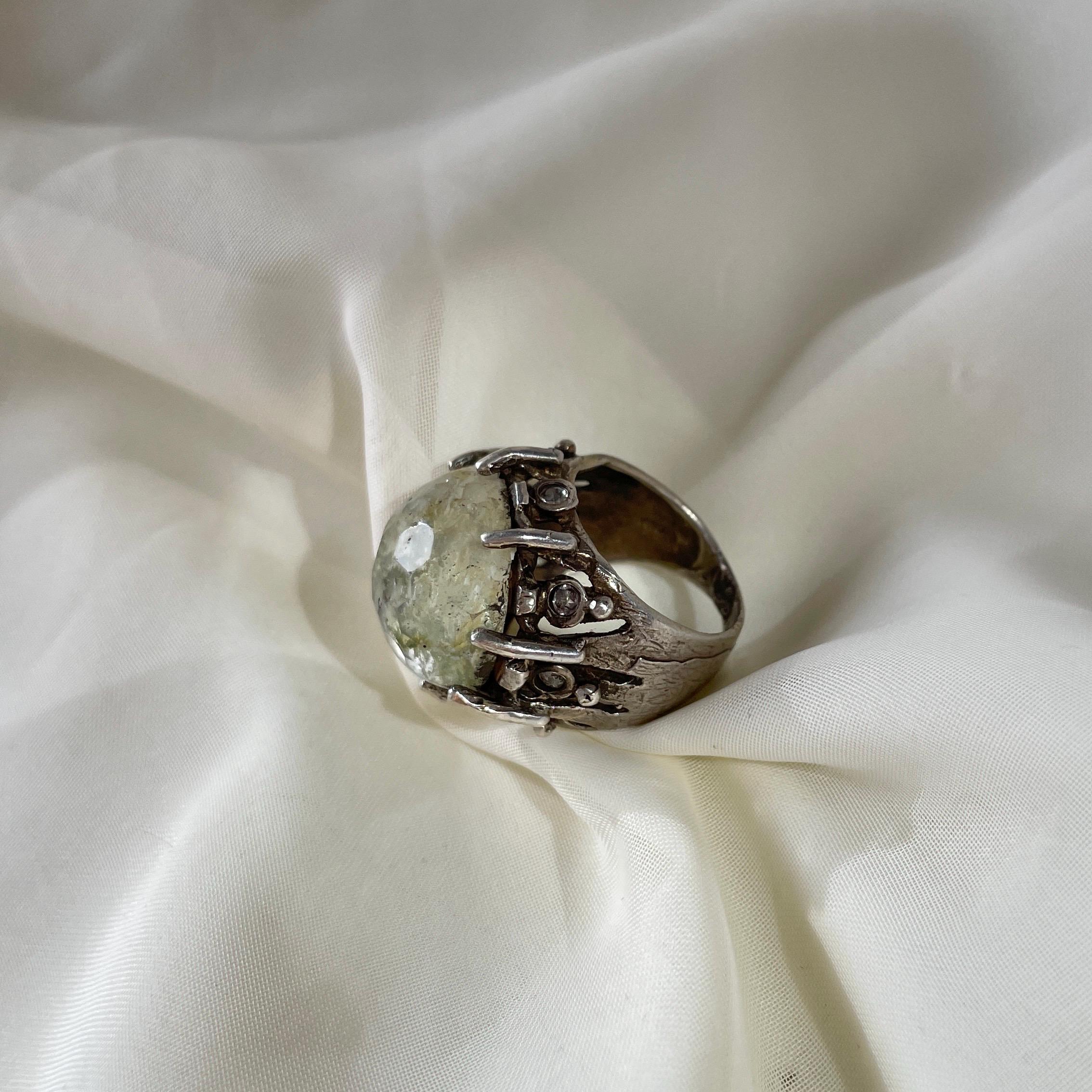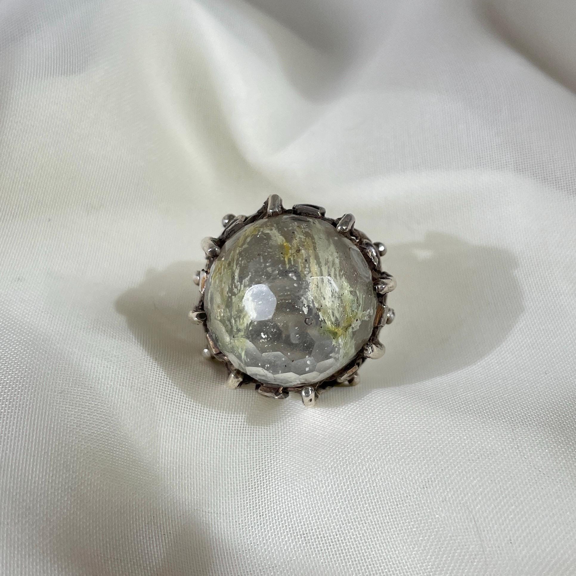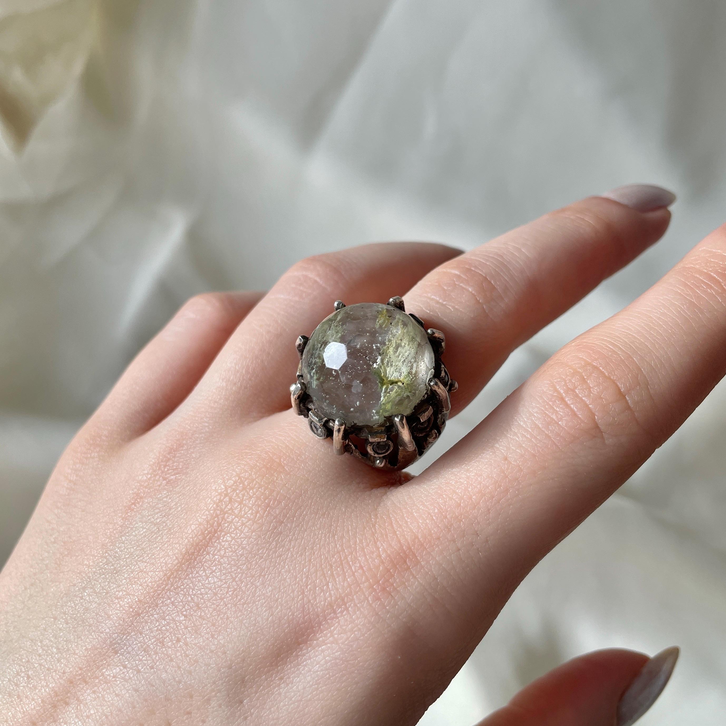 This stunning piece features a large dome-cut garden quartz stone, set in solid 925 sterling silver. The natural inclusions inside the quartz create a mesmerizing landscape — like a miniature world captured within the stone.