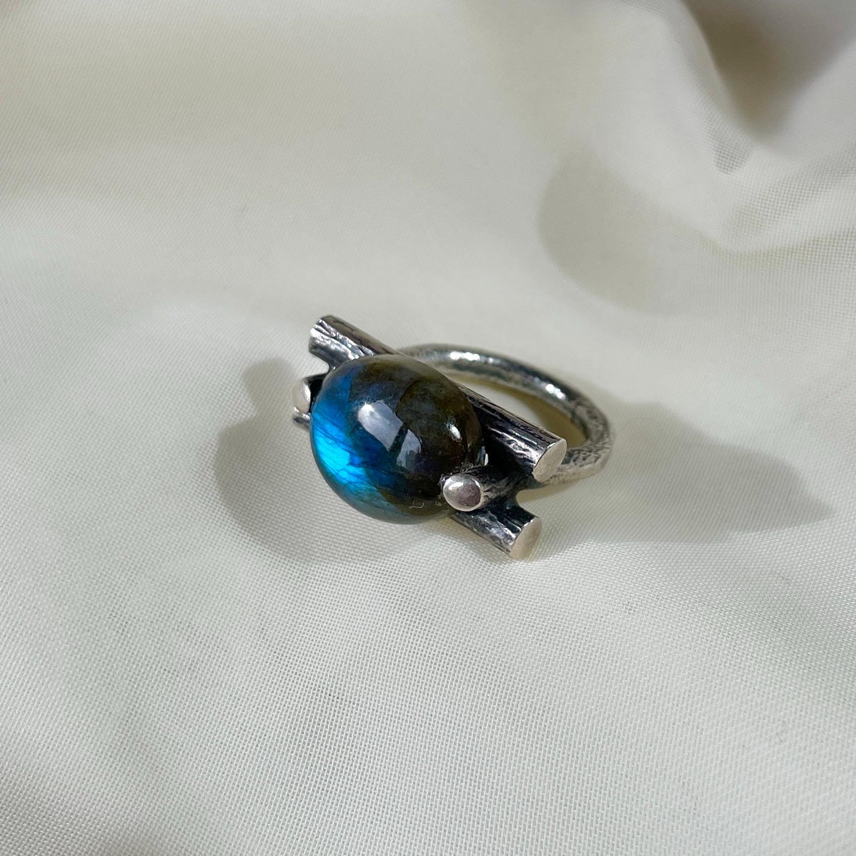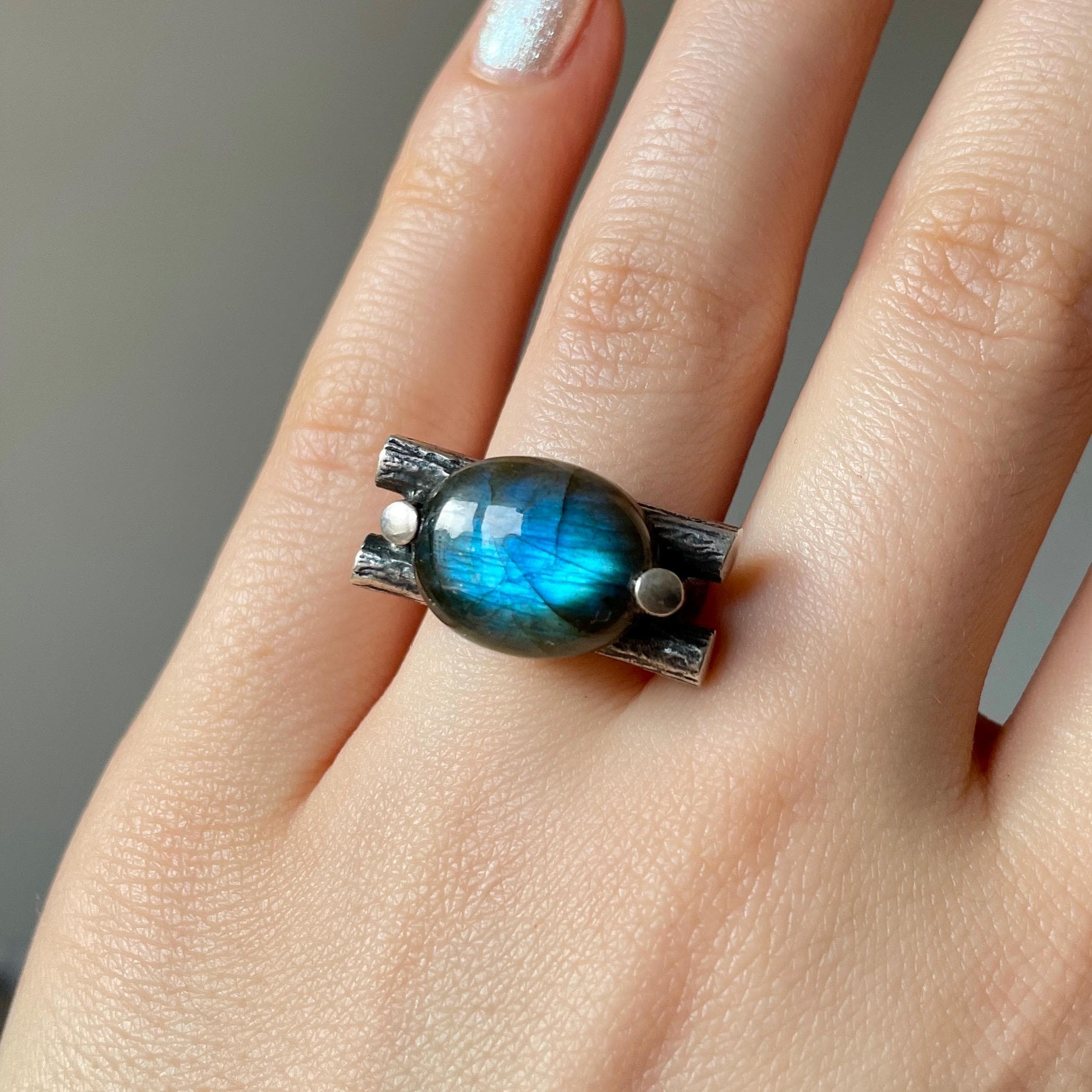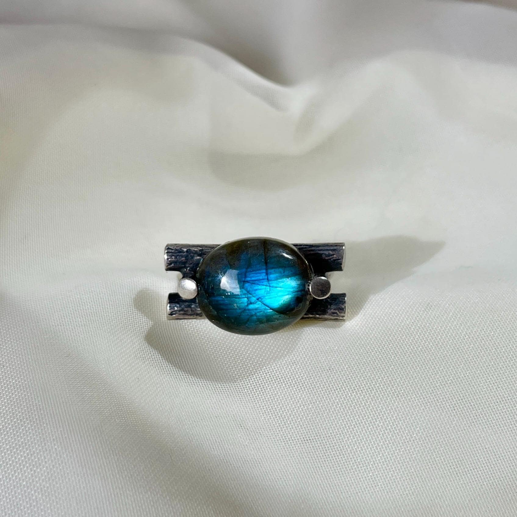 This handcrafted piece features a natural labradorite stone glowing with a deep blue flash, reminiscent of moonlight filtering through trees. Each movement reveals shifting tones — like hidden light within the stone.