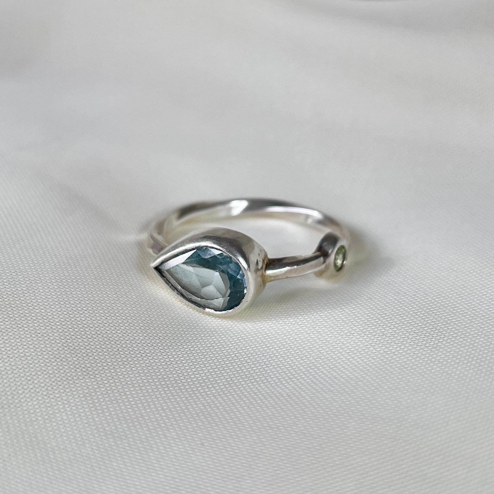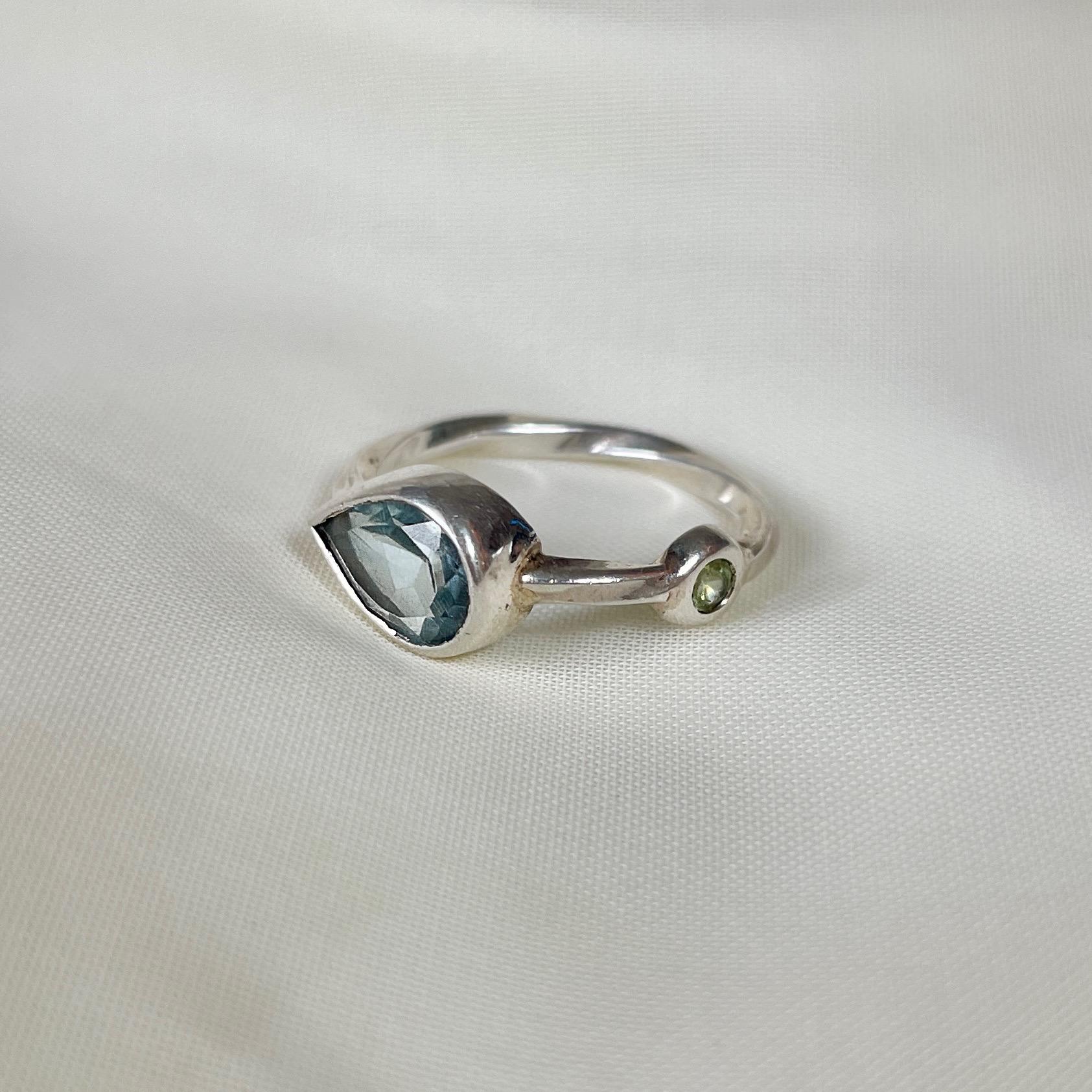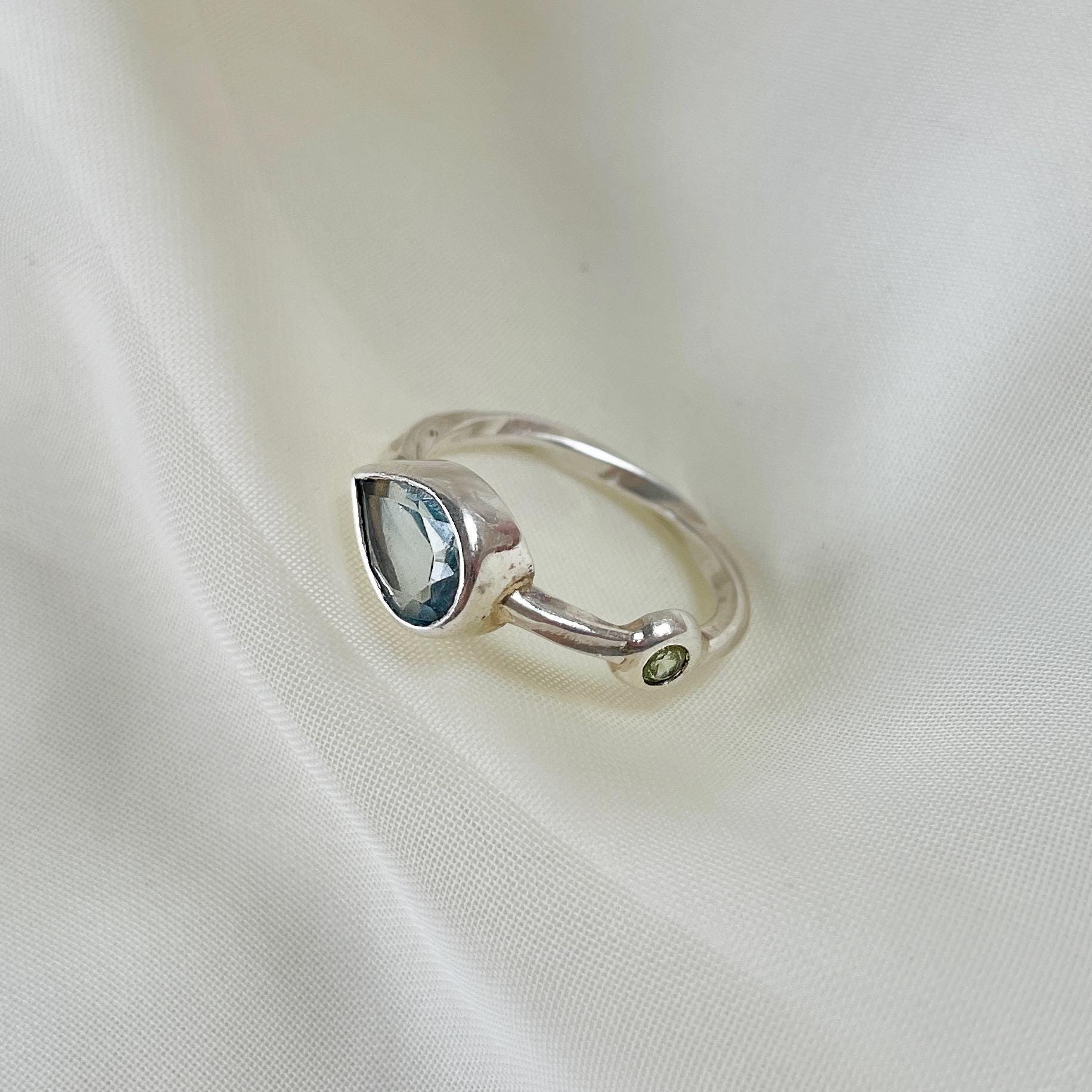 This handcrafted ring features a faceted teardrop-shaped blue topaz paired with a small round peridot accent. The soft contrast between cool blue and fresh green tones creates a refined yet eye-catching design.