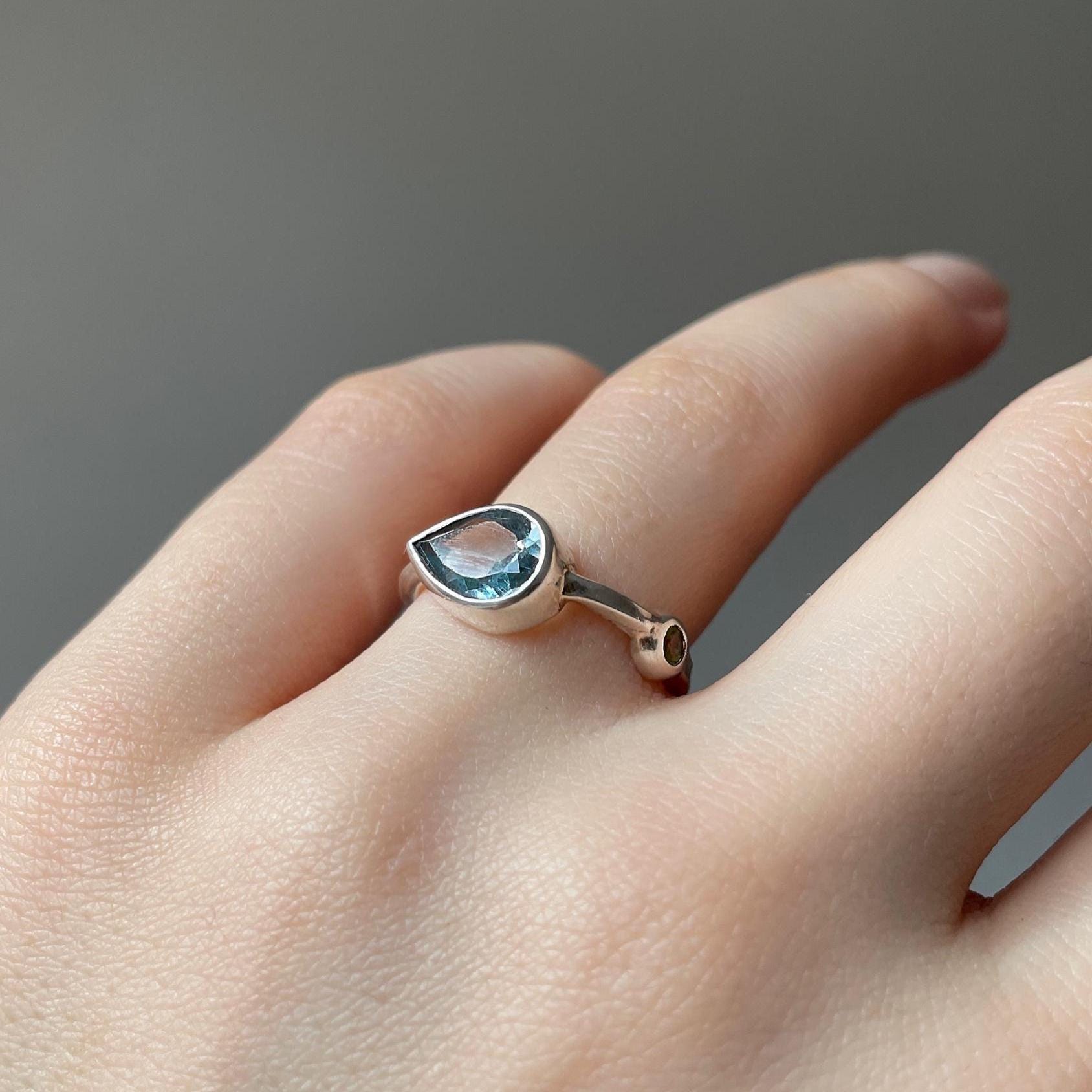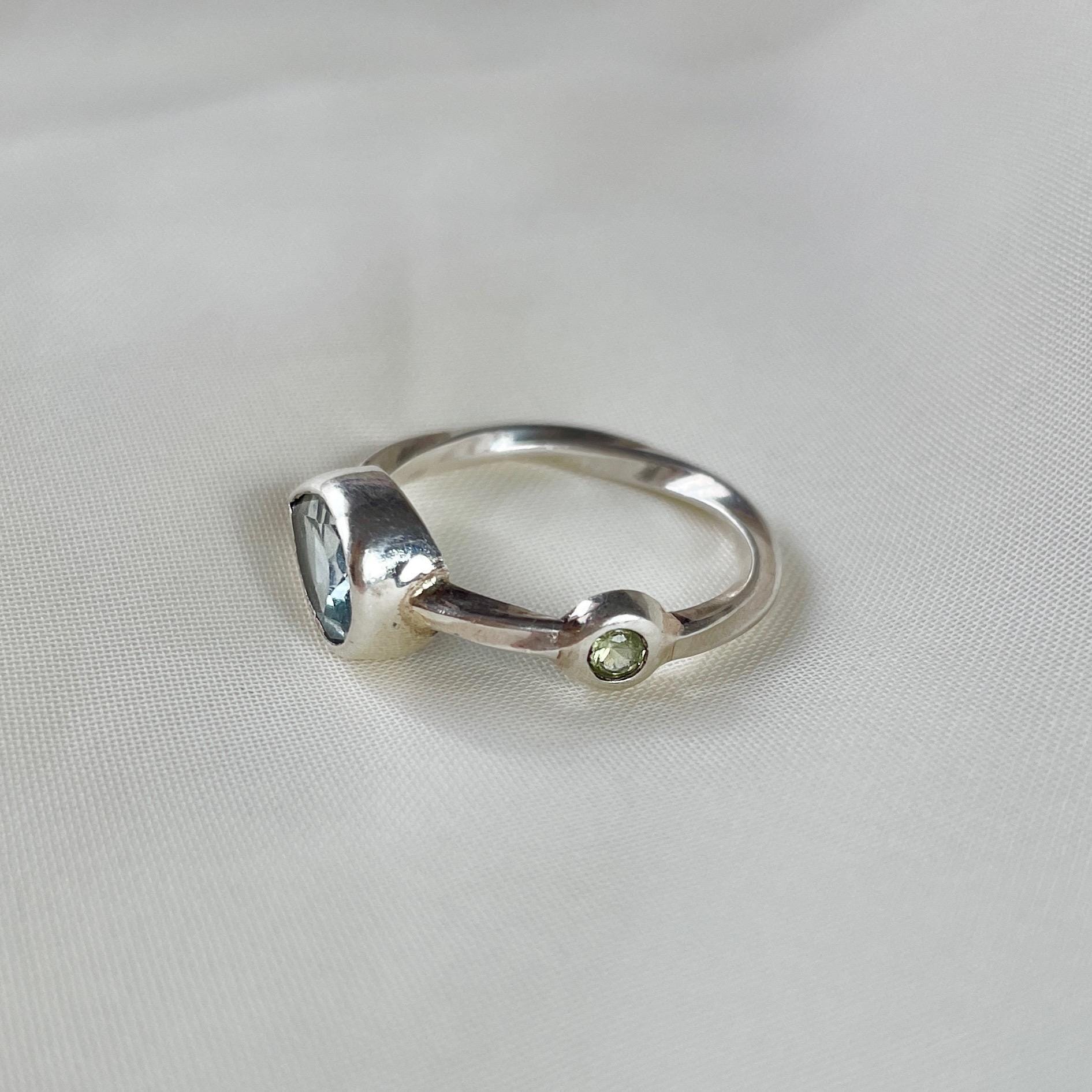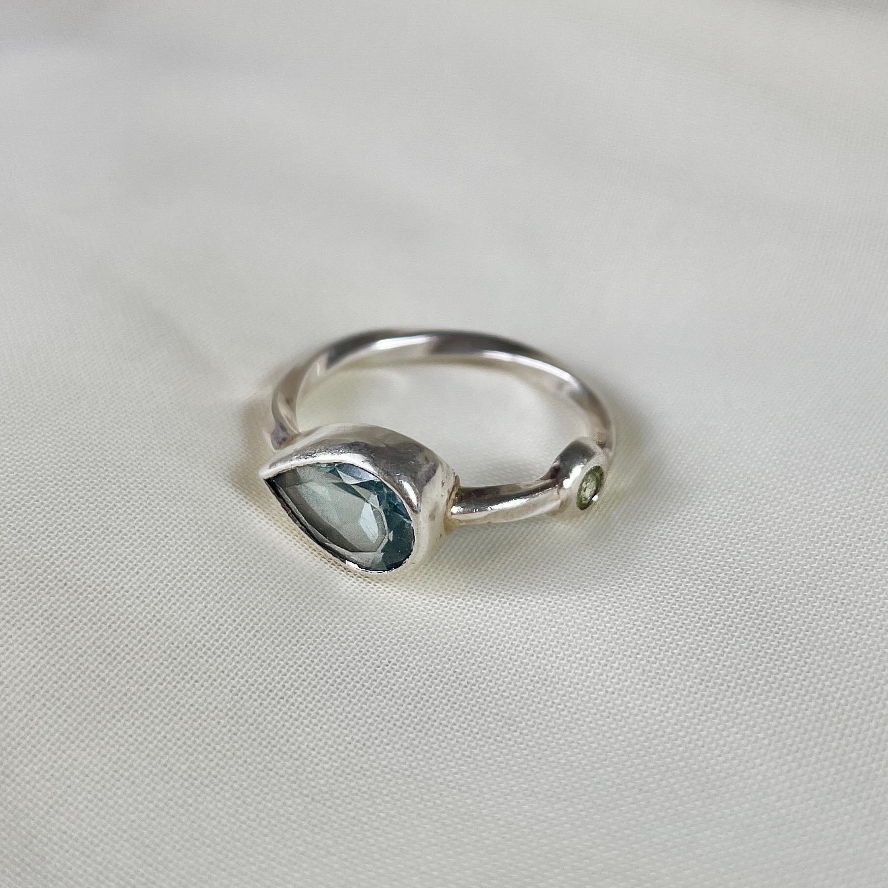 This handcrafted ring features a faceted teardrop-shaped blue topaz paired with a small round peridot accent. The soft contrast between cool blue and fresh green tones creates a refined yet eye-catching design.