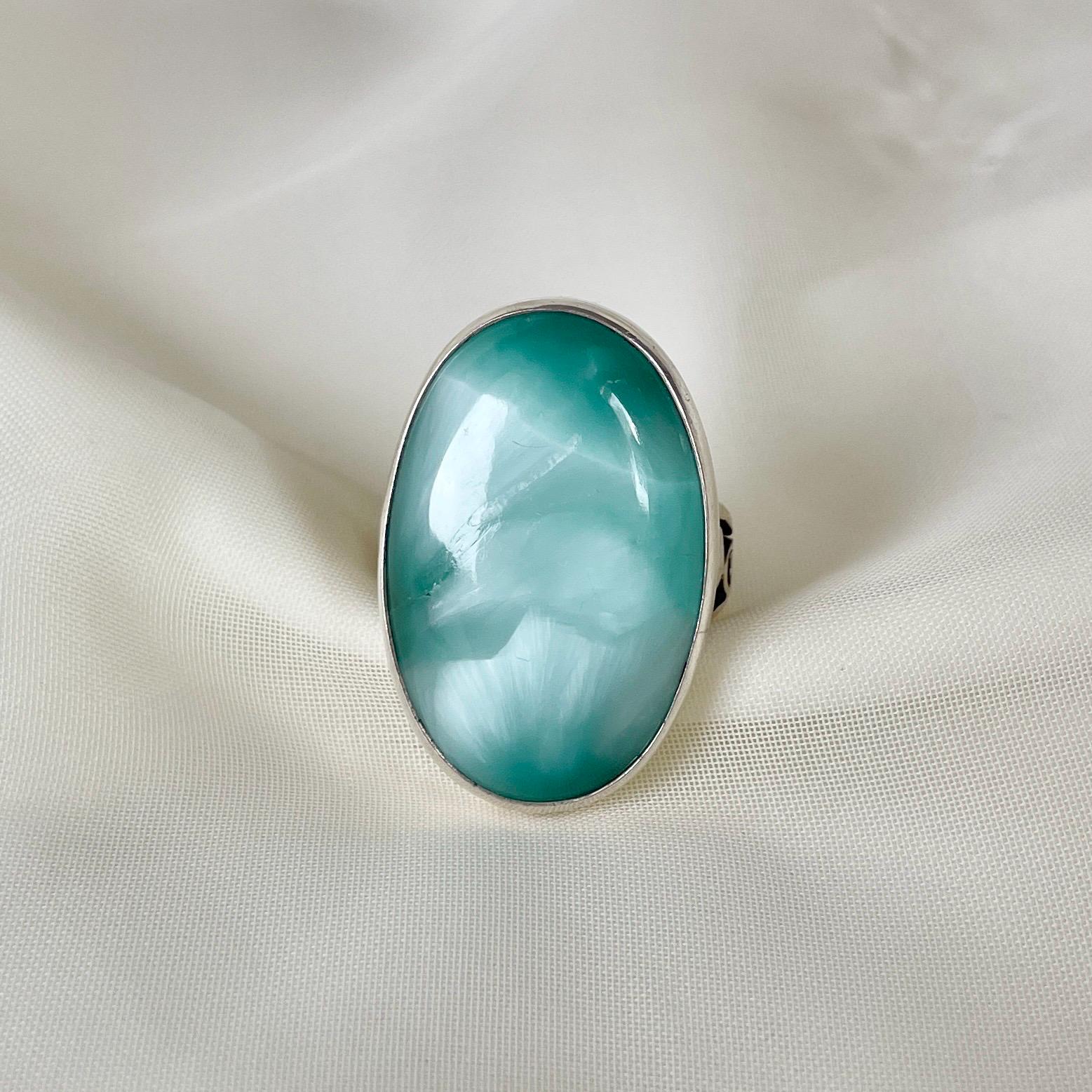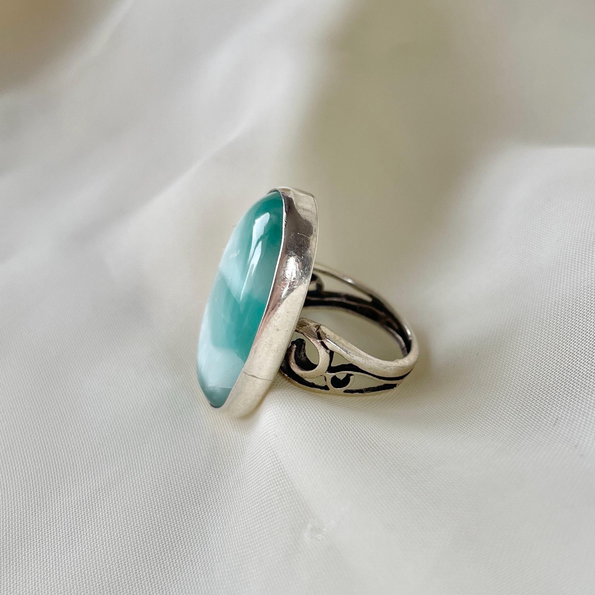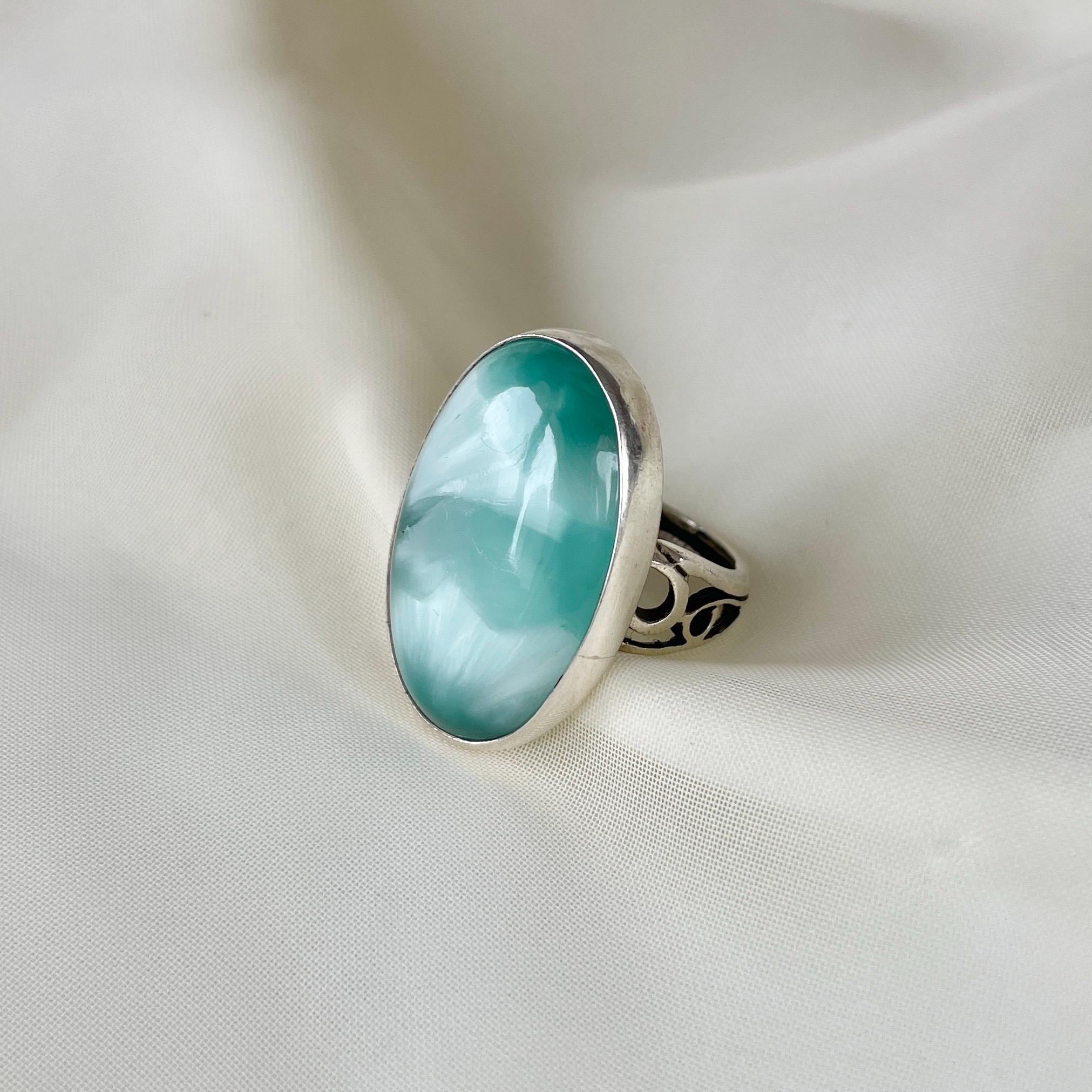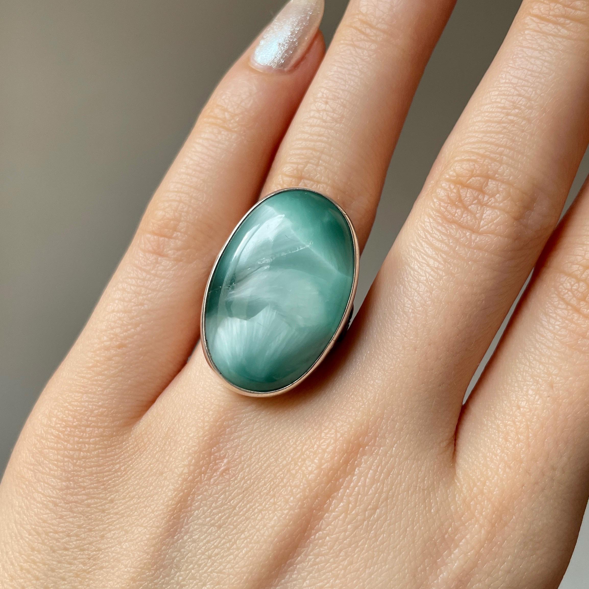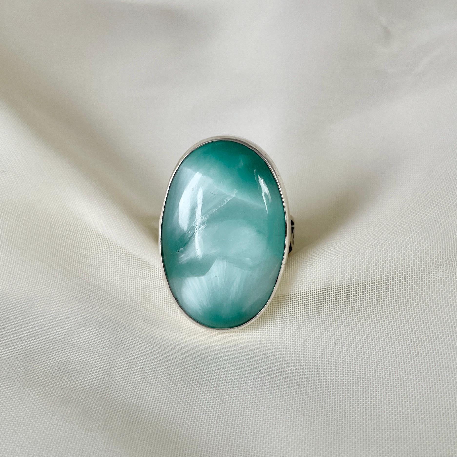 This handcrafted ring features a large oval hemimorphite stone, set in solid 925 sterling silver. The soft blue-green tones blend like clouds and water, creating a calming yet striking visual presence.