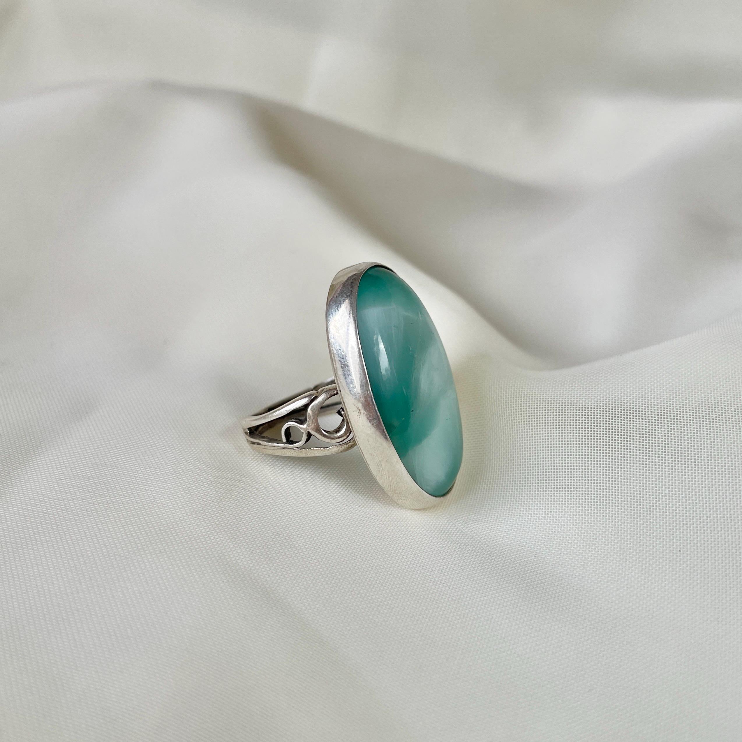 The smooth cabochon cut enhances this optical phenomenon, giving the ring a dreamy and almost ethereal appearance.
