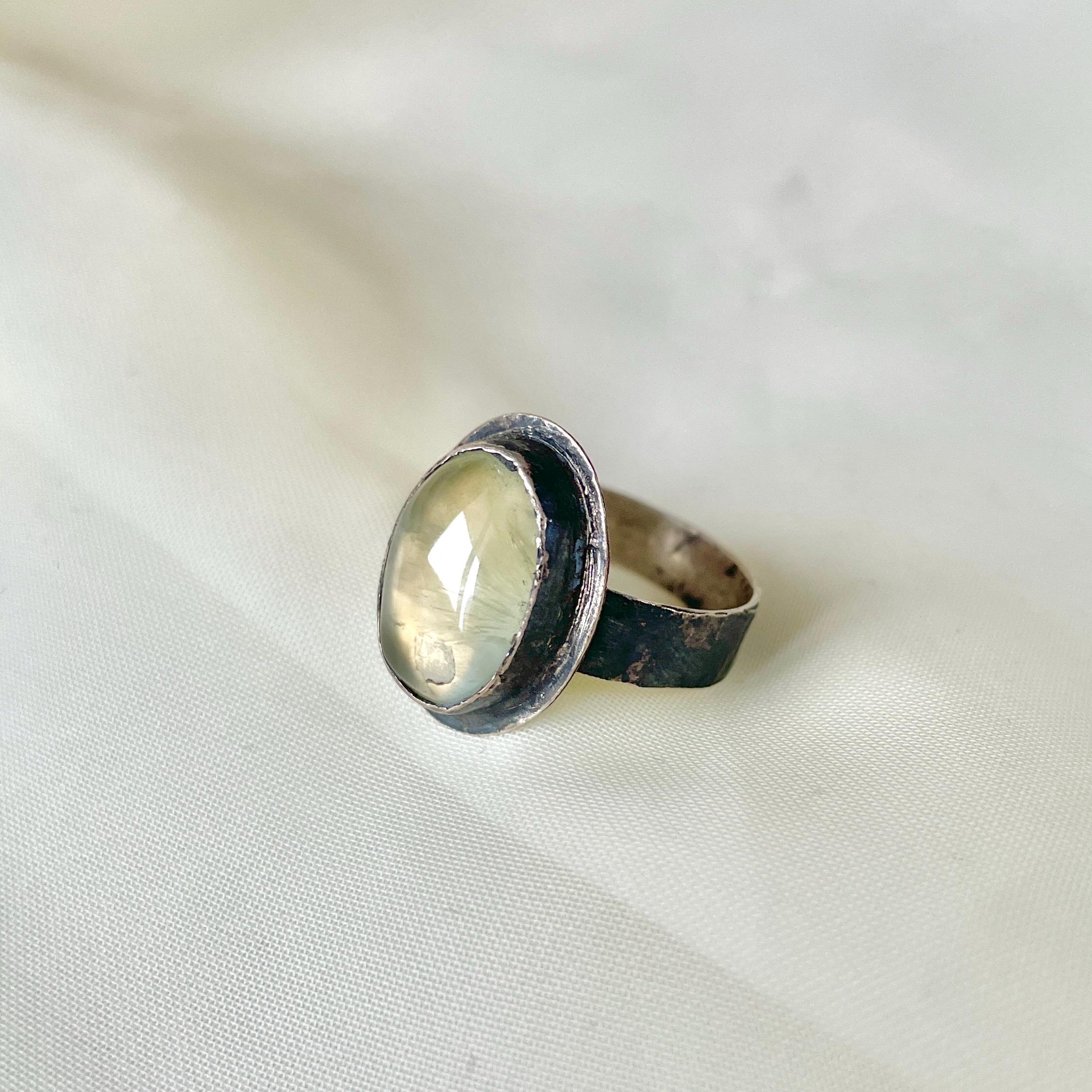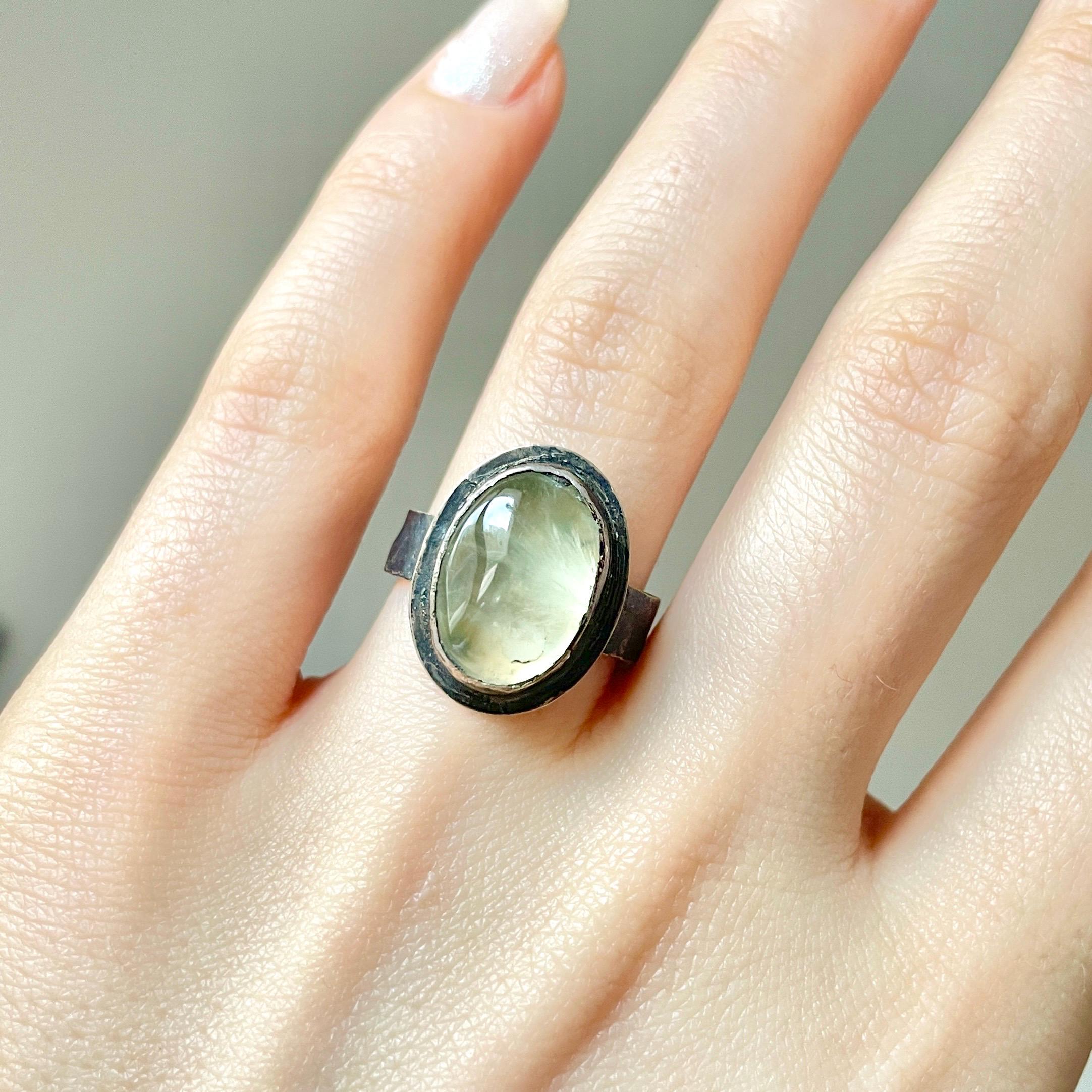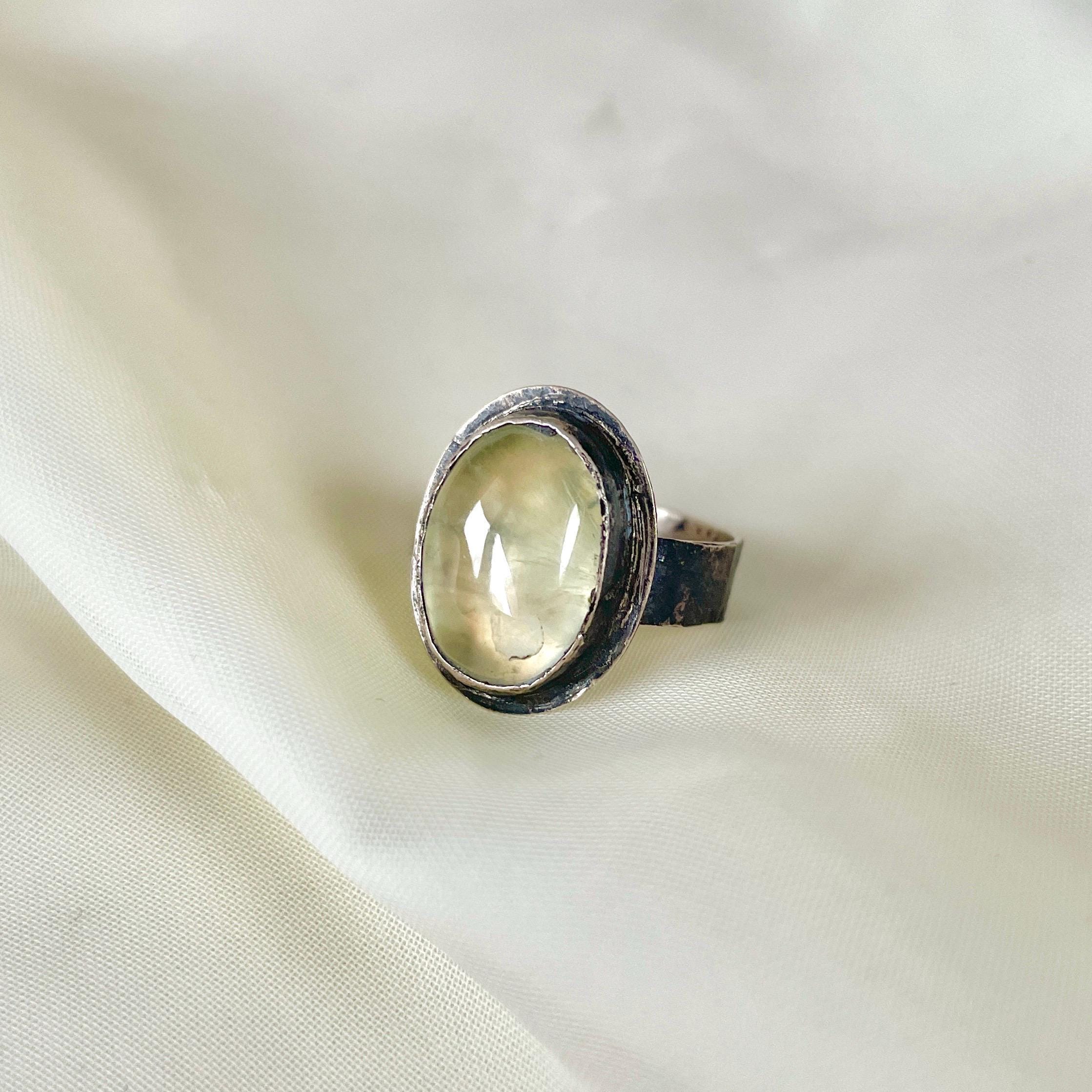 This handcrafted ring features a natural prehnite stone with soft translucent green tones and a gentle inner glow. Its smooth cabochon surface highlights the organic beauty of the stone.