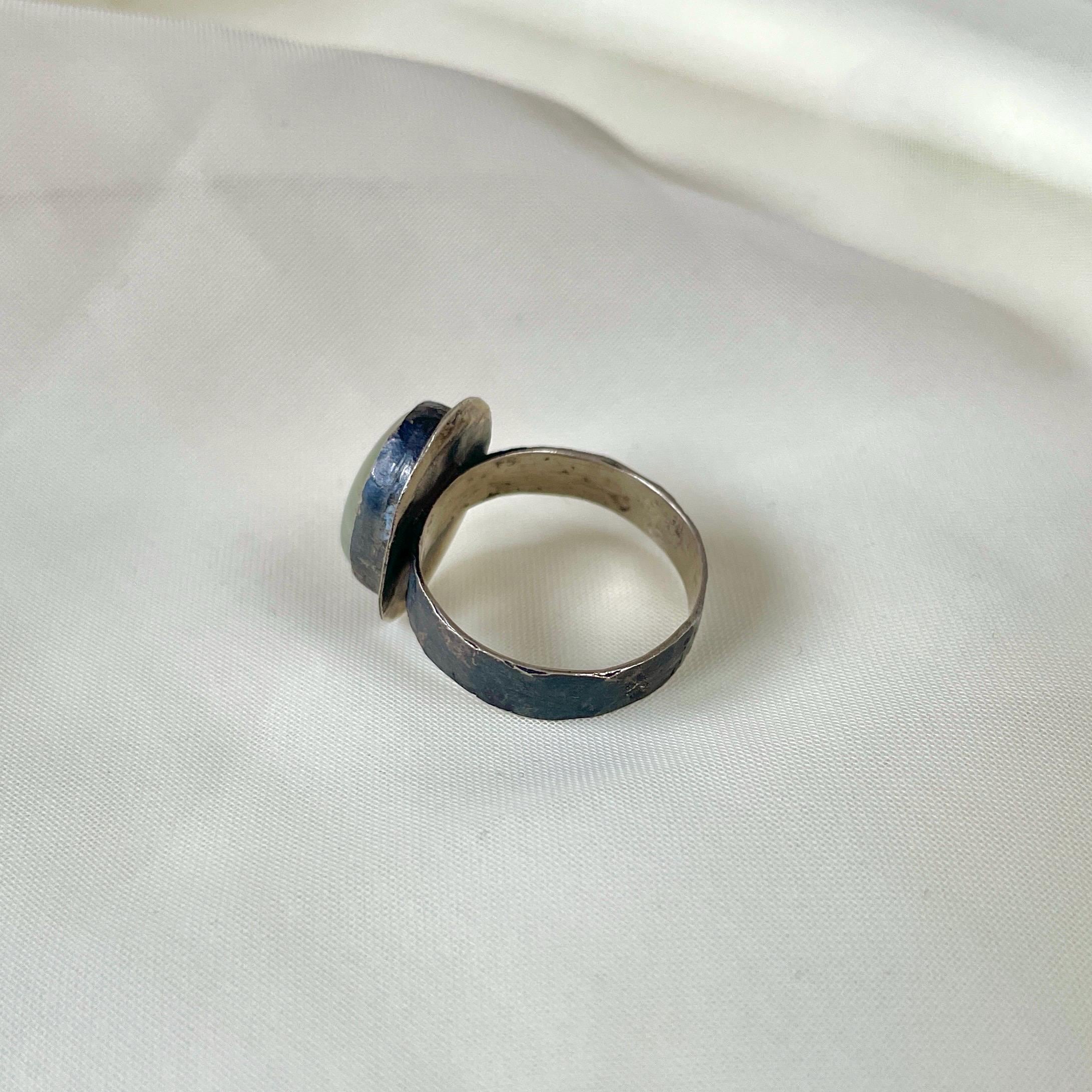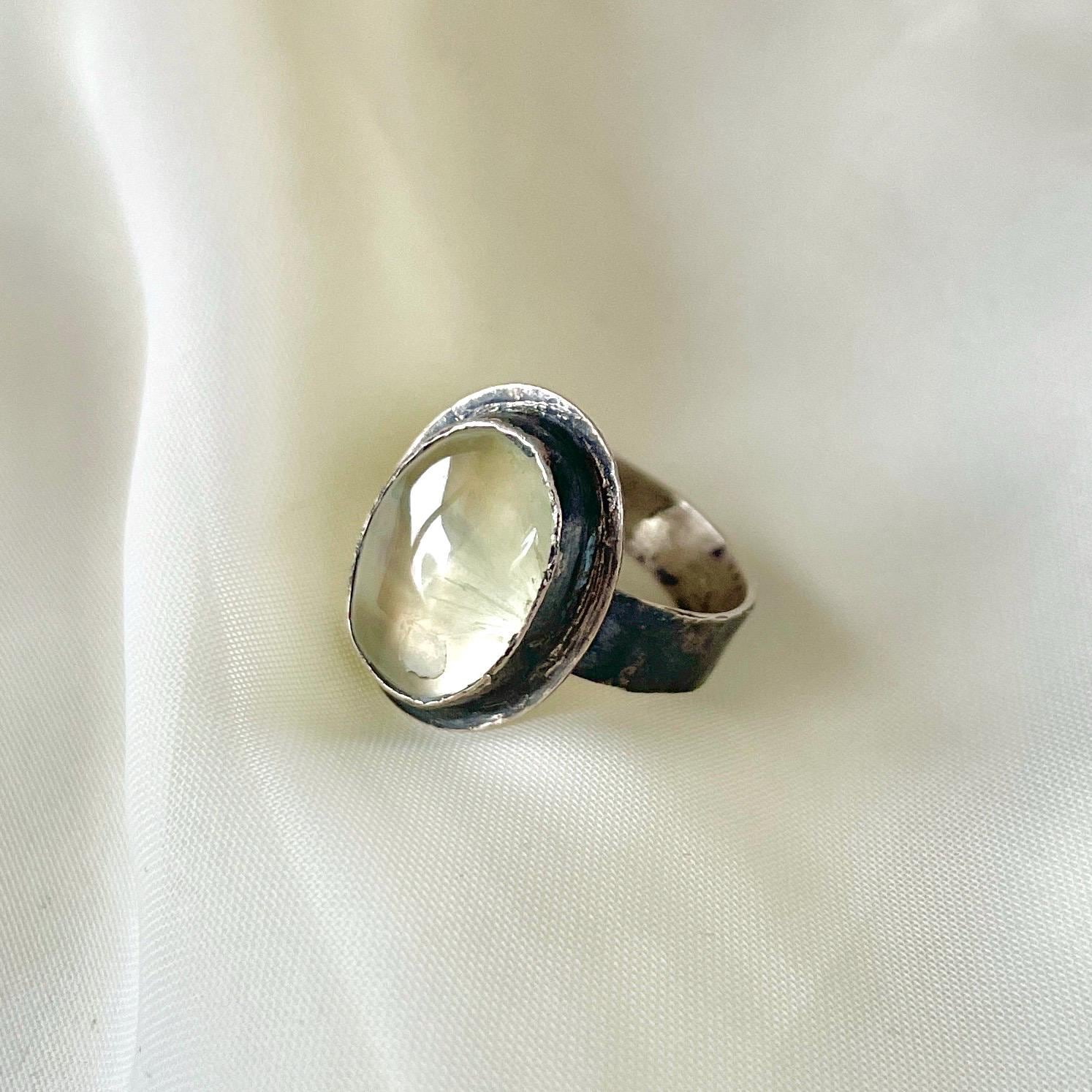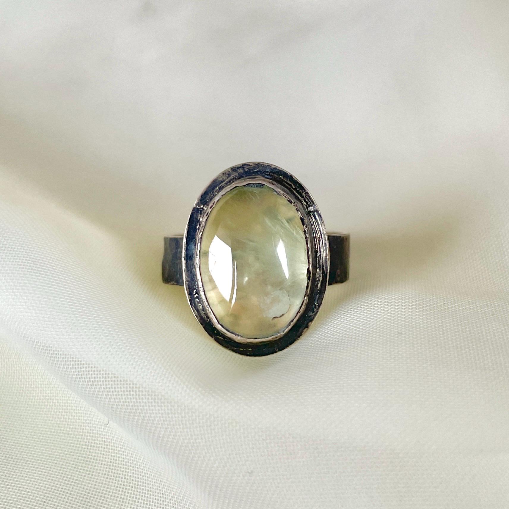 This handcrafted ring features a natural prehnite stone with soft translucent green tones and a gentle inner glow. Its smooth cabochon surface highlights the organic beauty of the stone.
