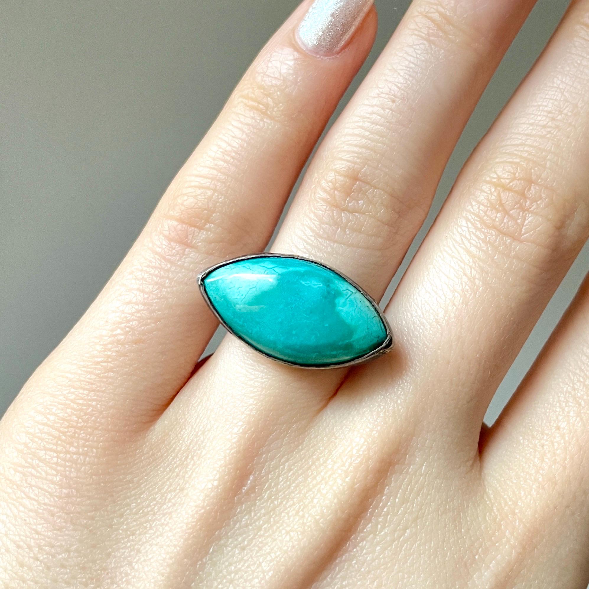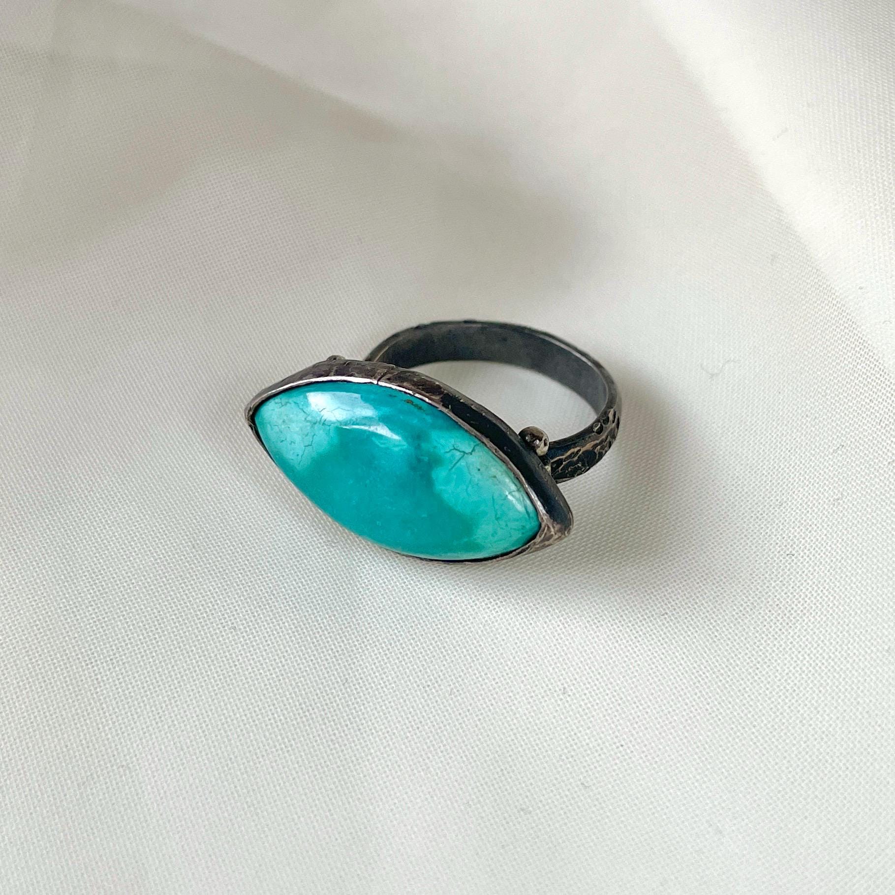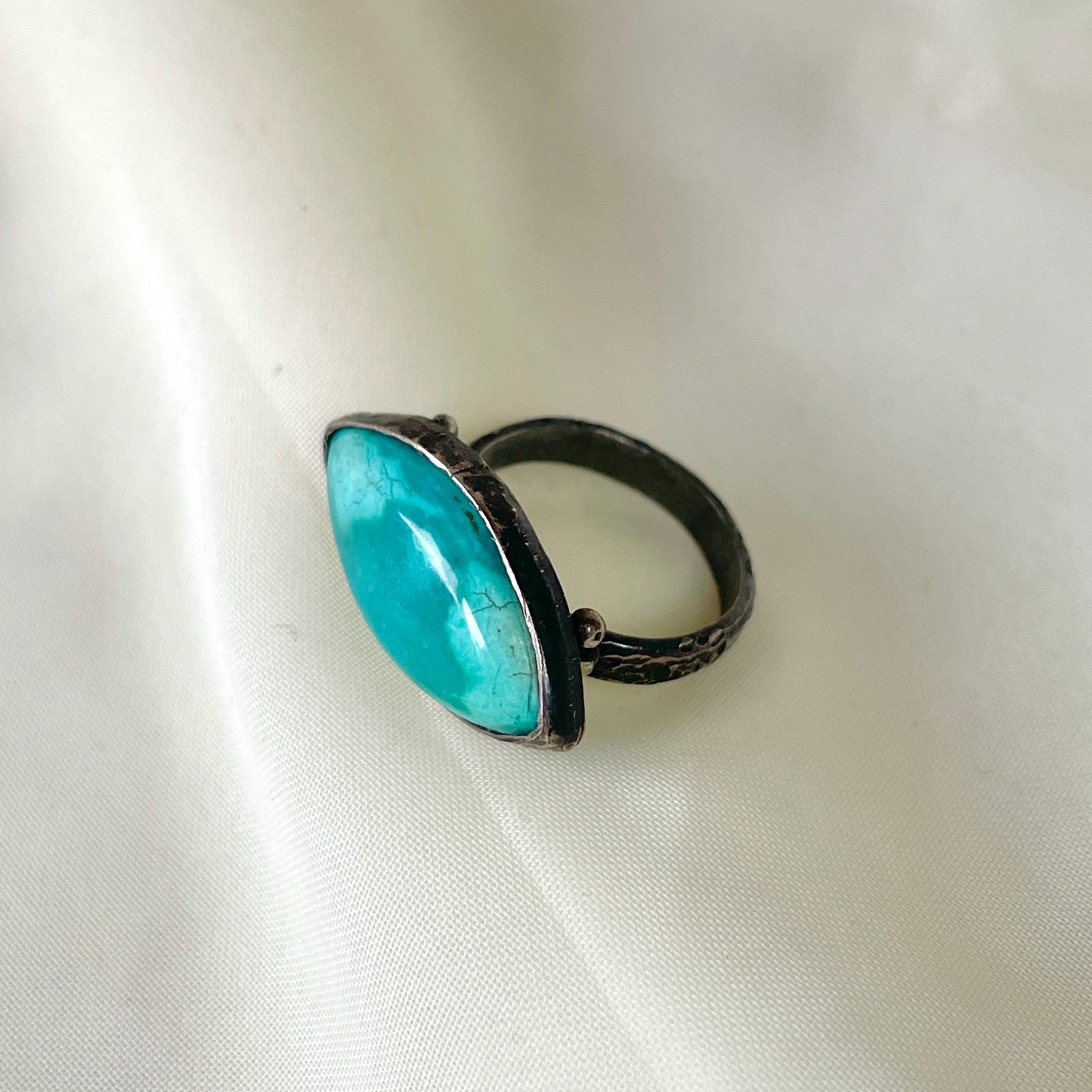 This handcrafted ring features a natural turquoise stone shaped in an elegant eye form. While often referred to as marquise cut, its elongated shape strongly resembles an eye — a timeless symbol of protection against negative energy.