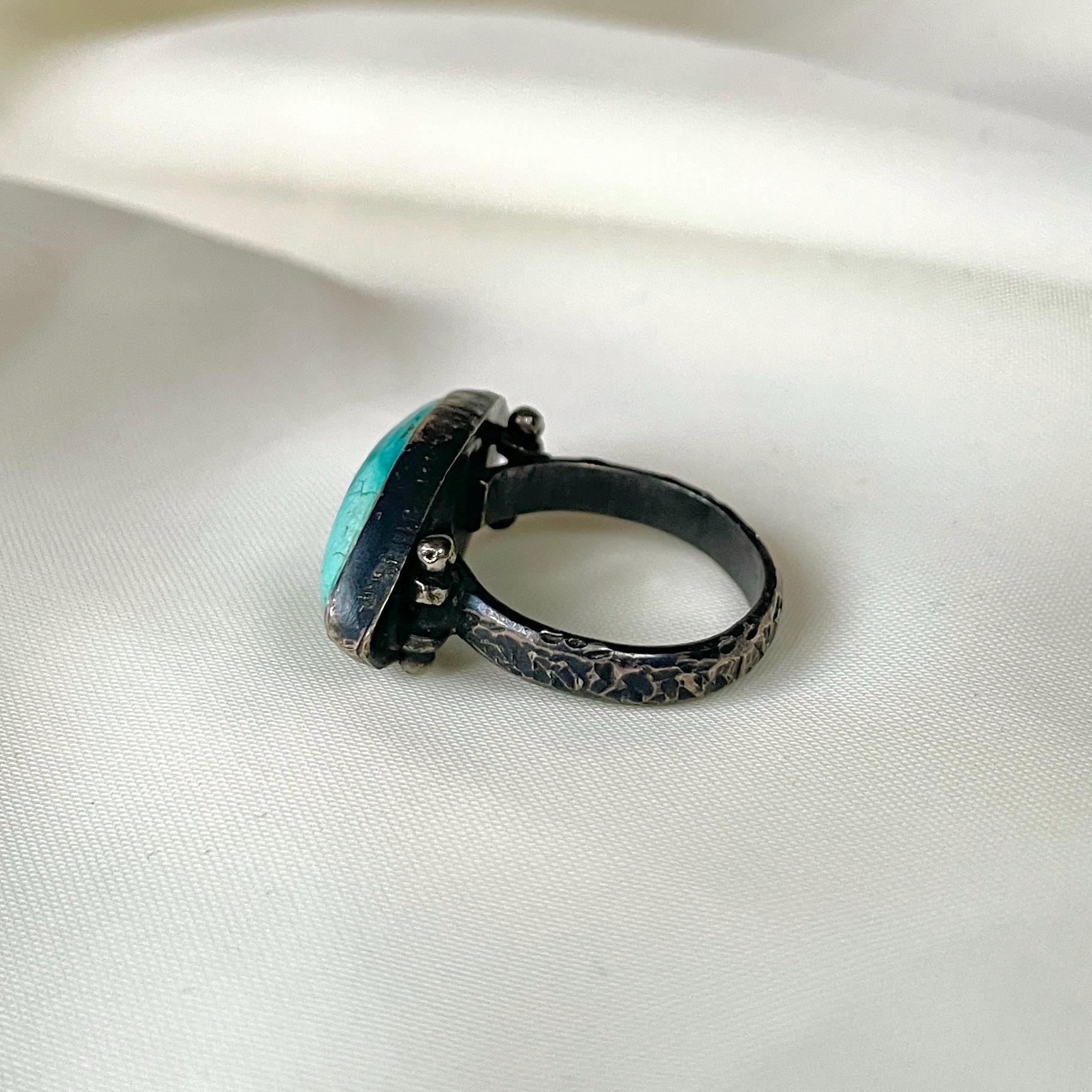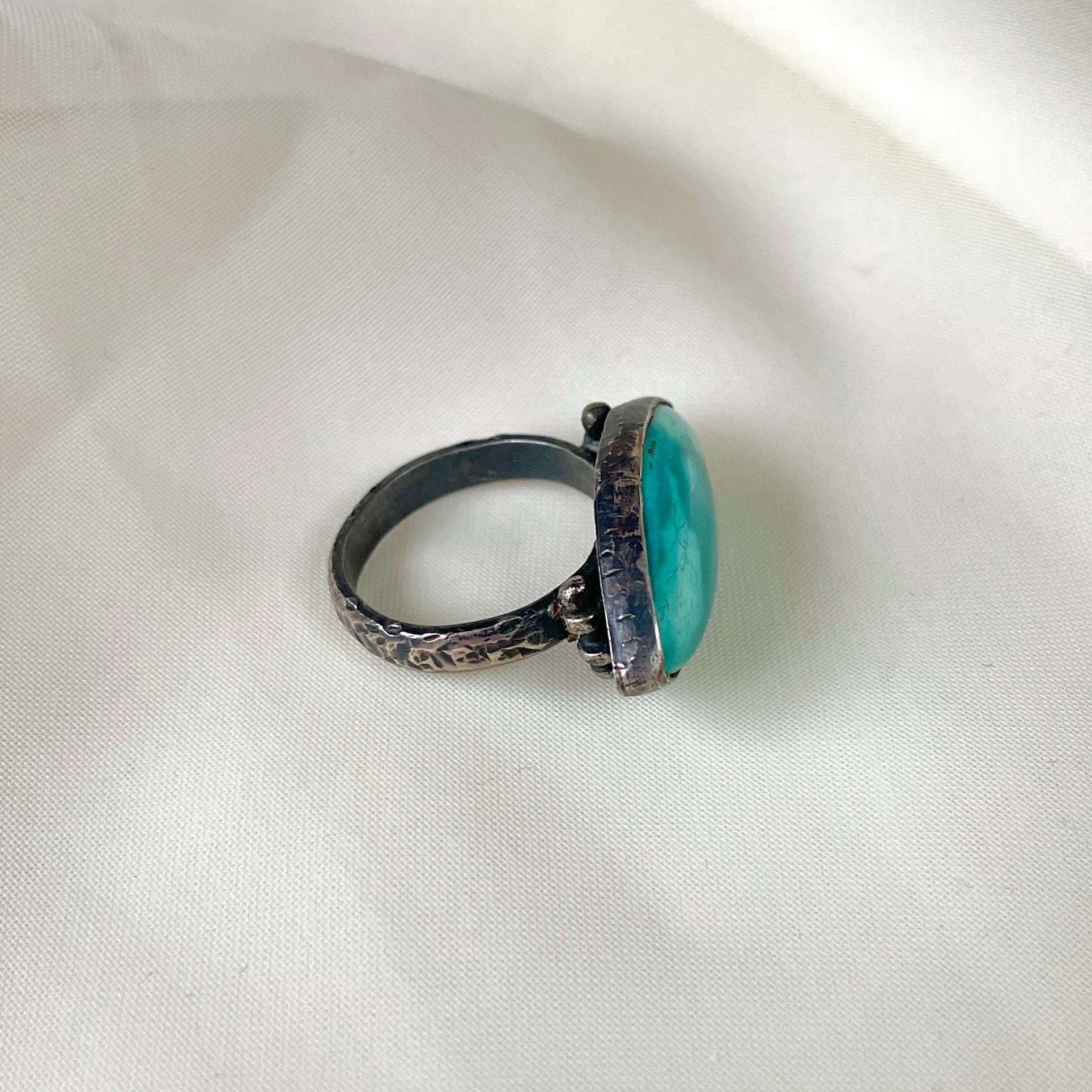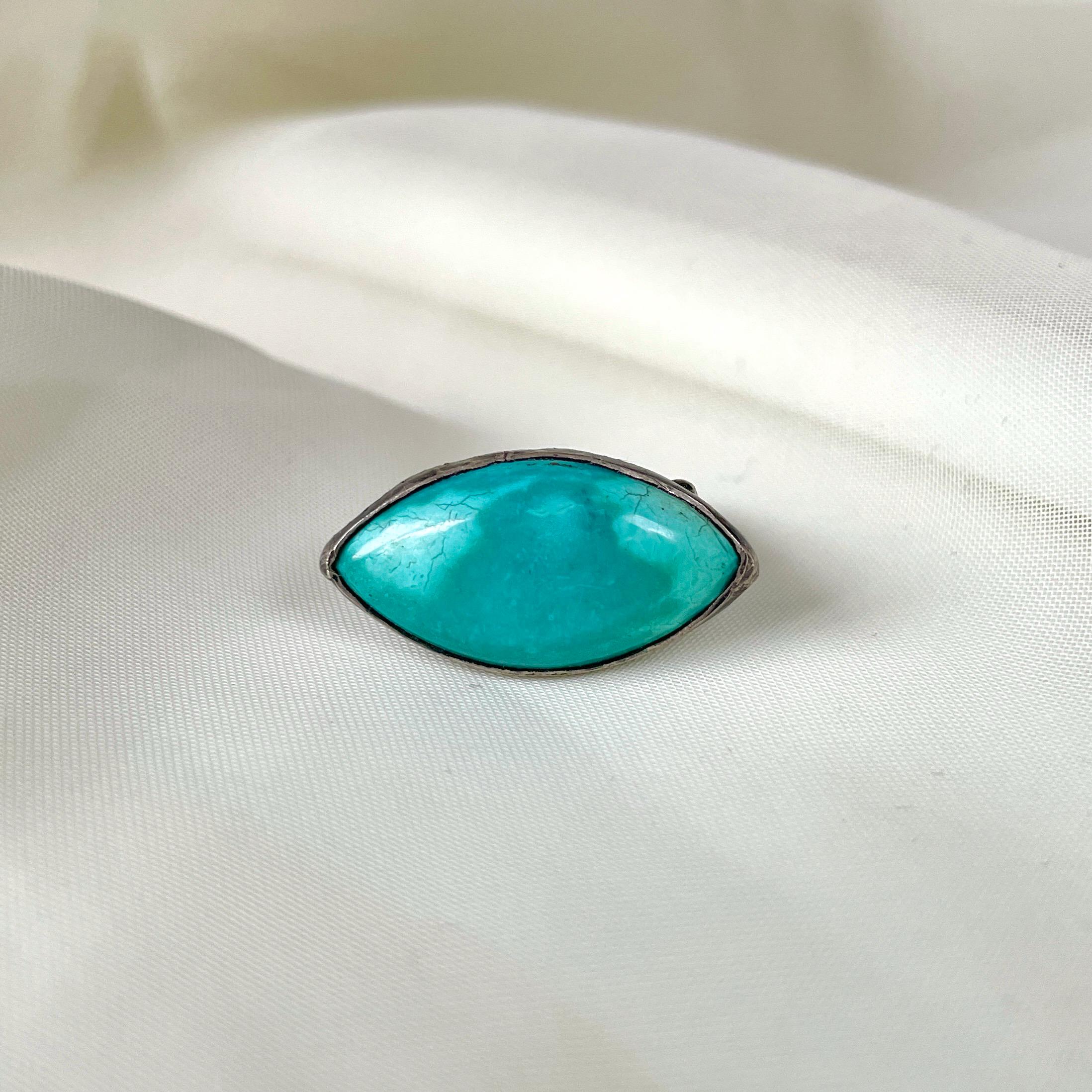 This handcrafted ring features a natural turquoise stone shaped in an elegant eye form. While often referred to as marquise cut, its elongated shape strongly resembles an eye — a timeless symbol of protection against negative energy.