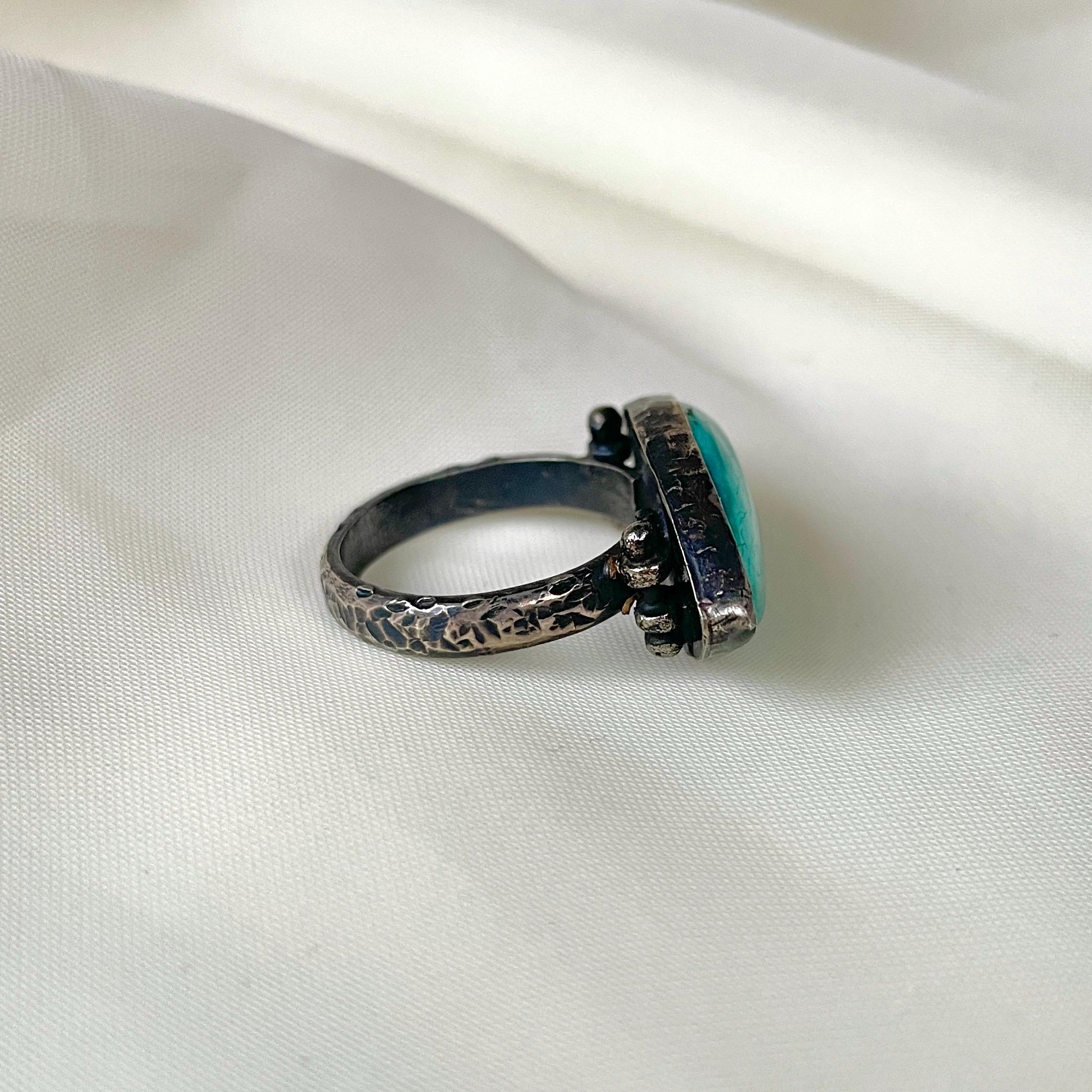 Set in solid 925 sterling silver with an oxidized finish, the ring carries a raw, artisan character. The textured band and handcrafted details give each piece a unique identity.